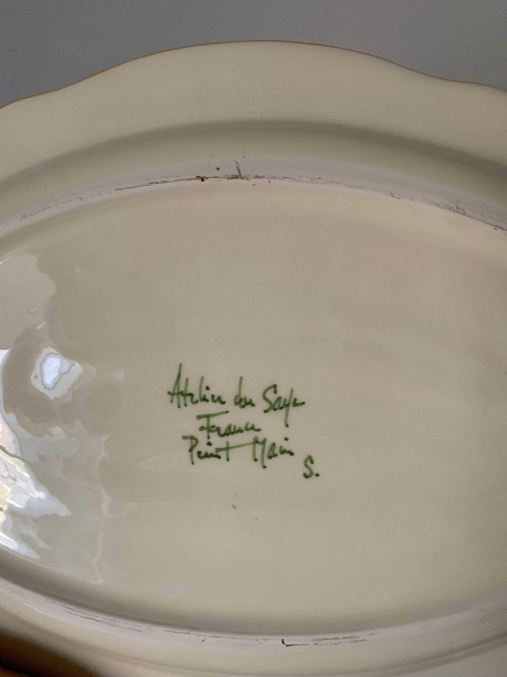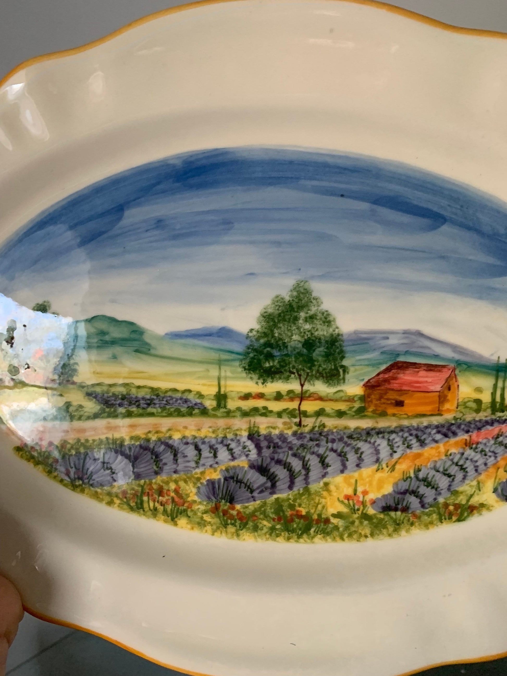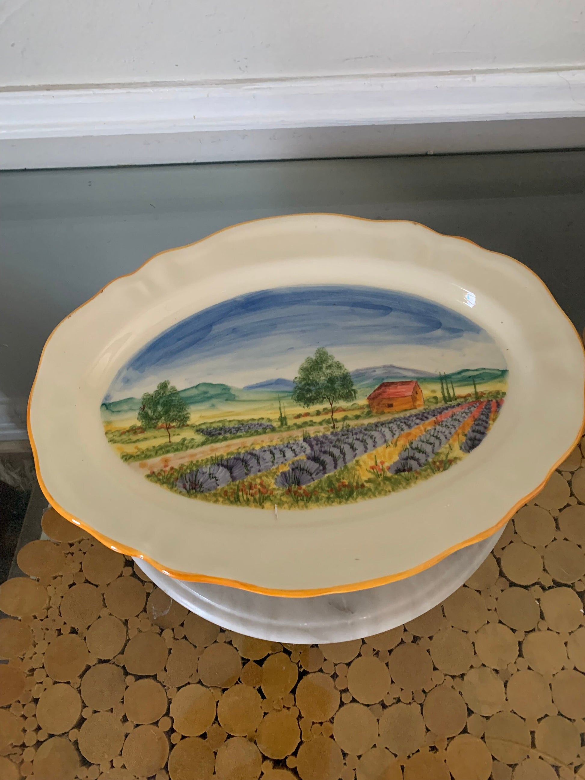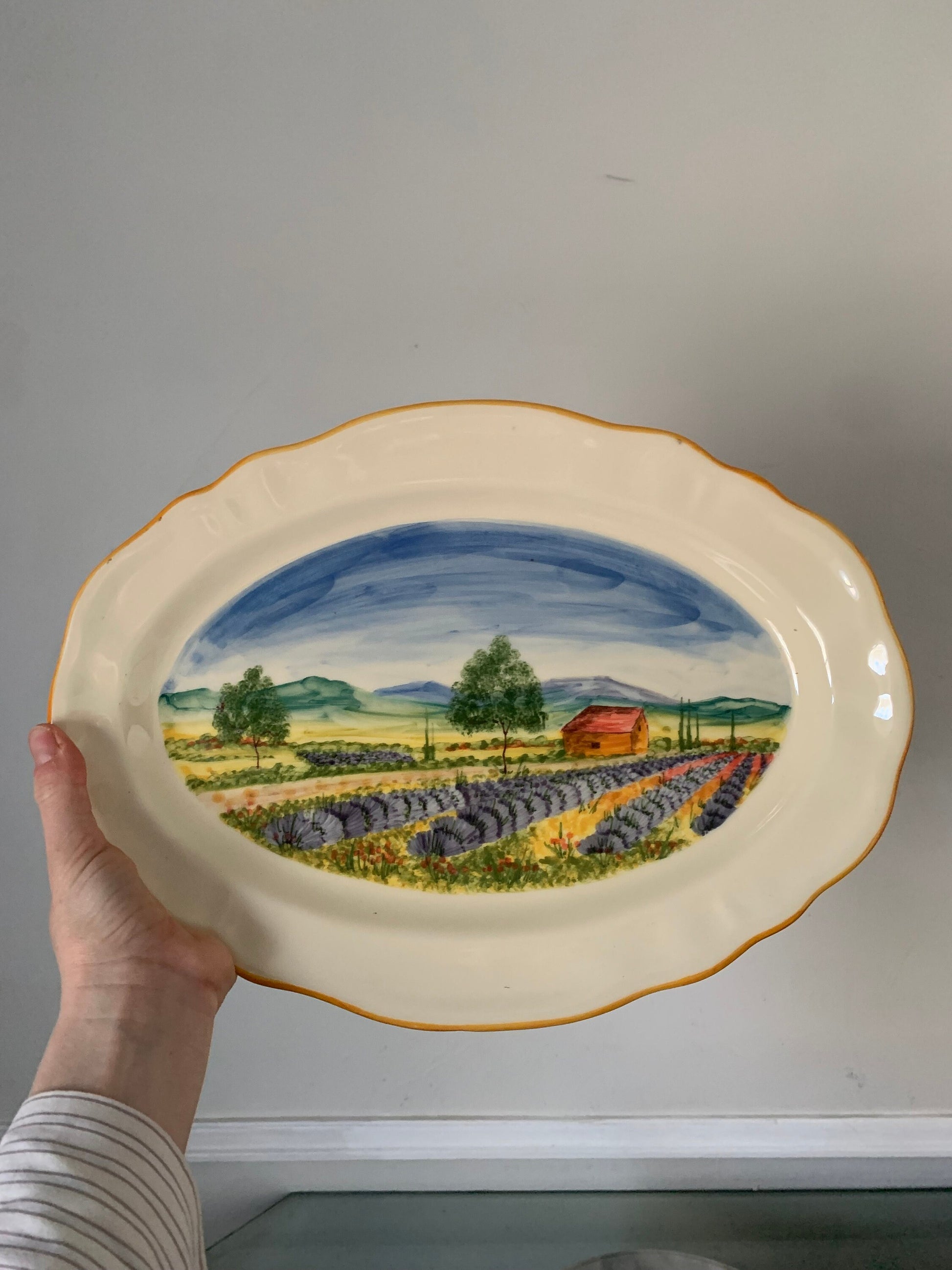 Absolutely beautiful, hand painted, glazed ceramic platter depicting lavender fields. Made in France, Faience Provence.