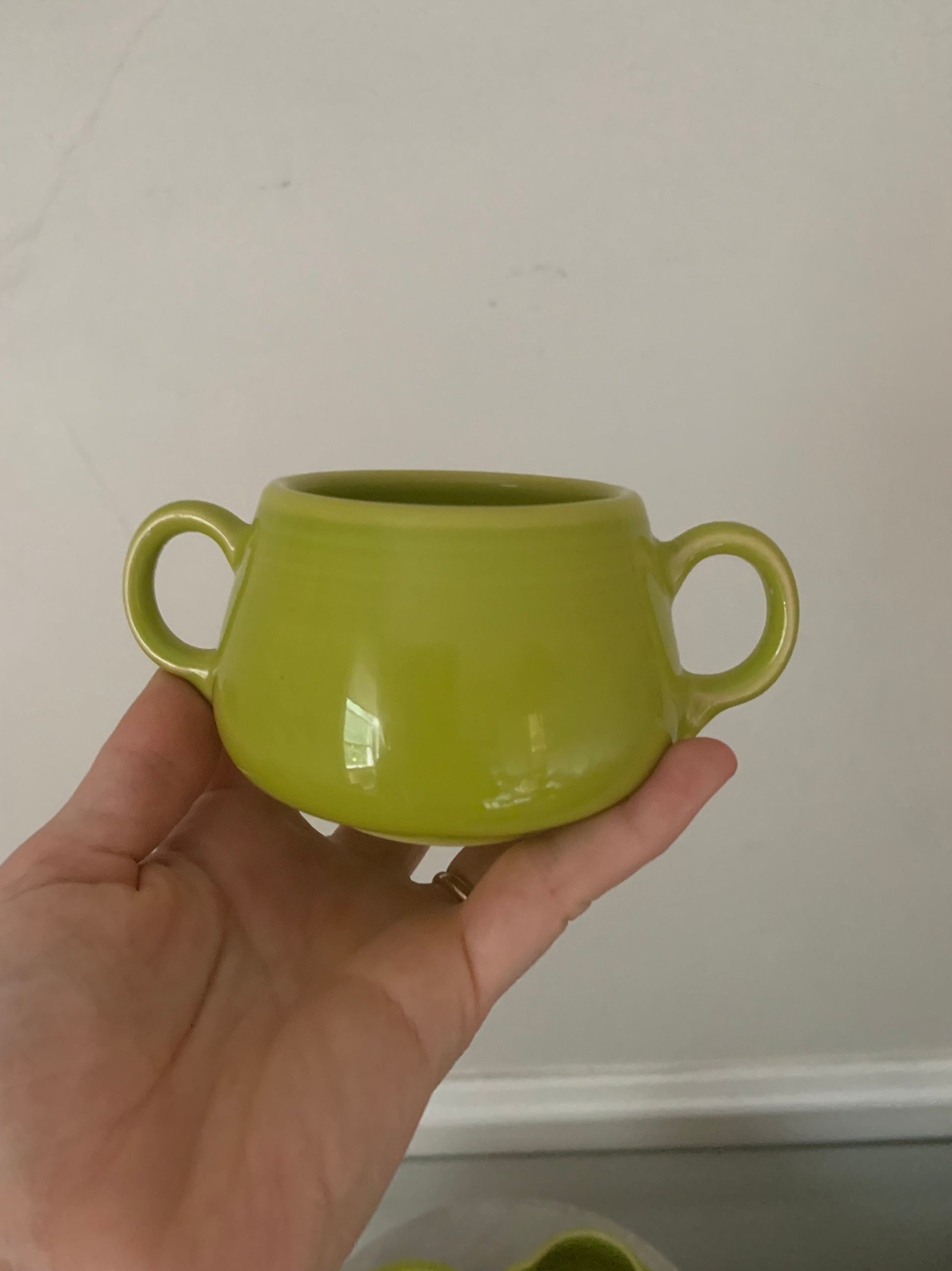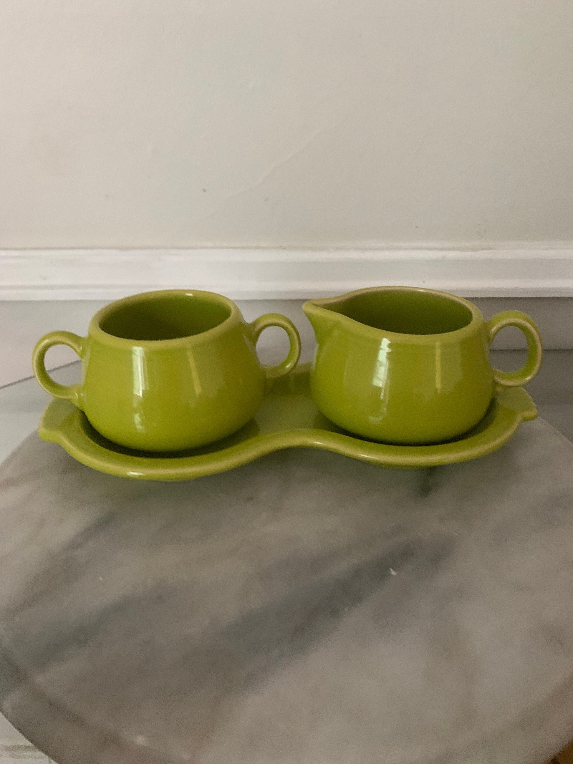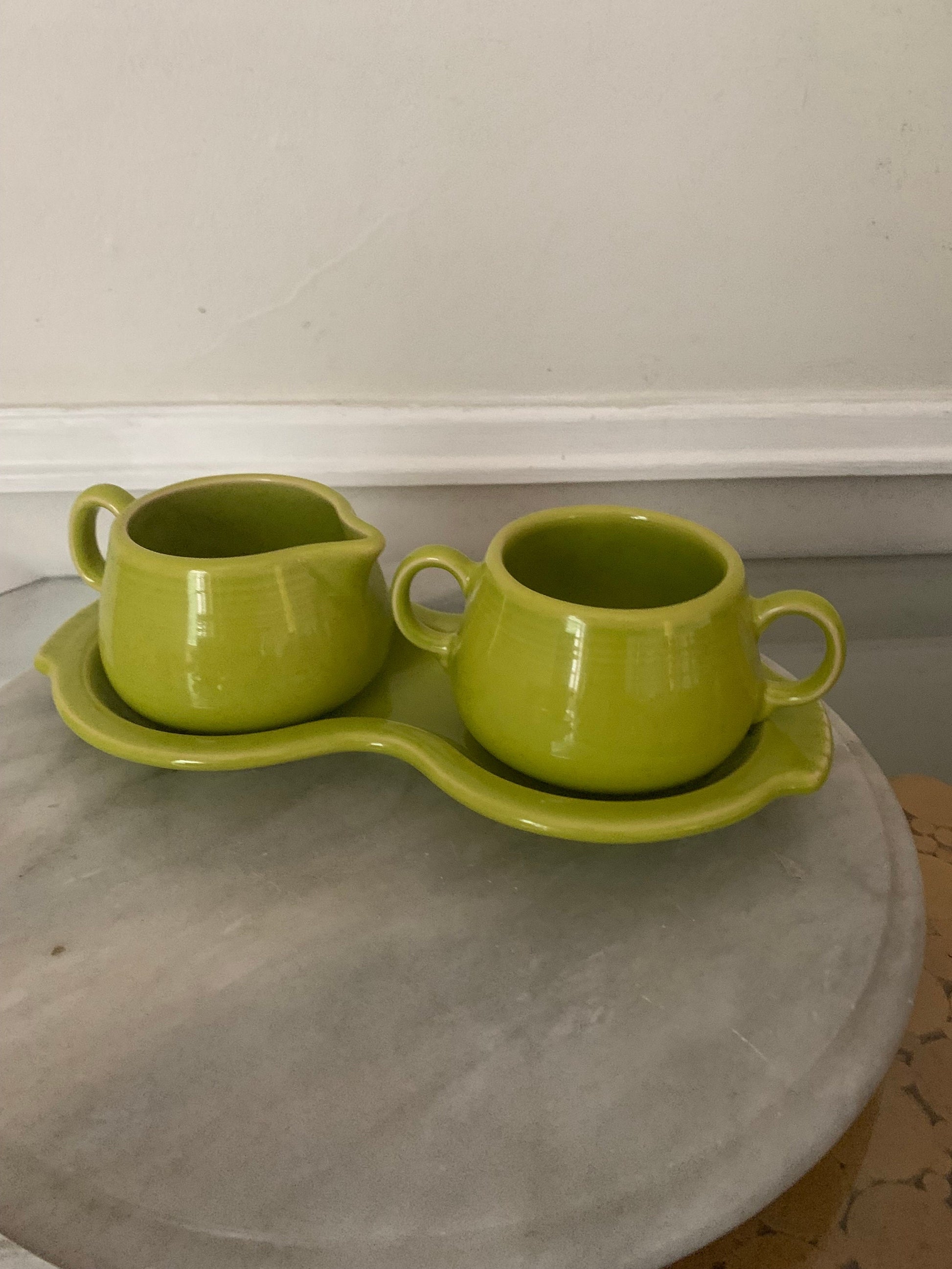 Beautiful vintage Fiestaware cream and sugar set with tray in lime green.