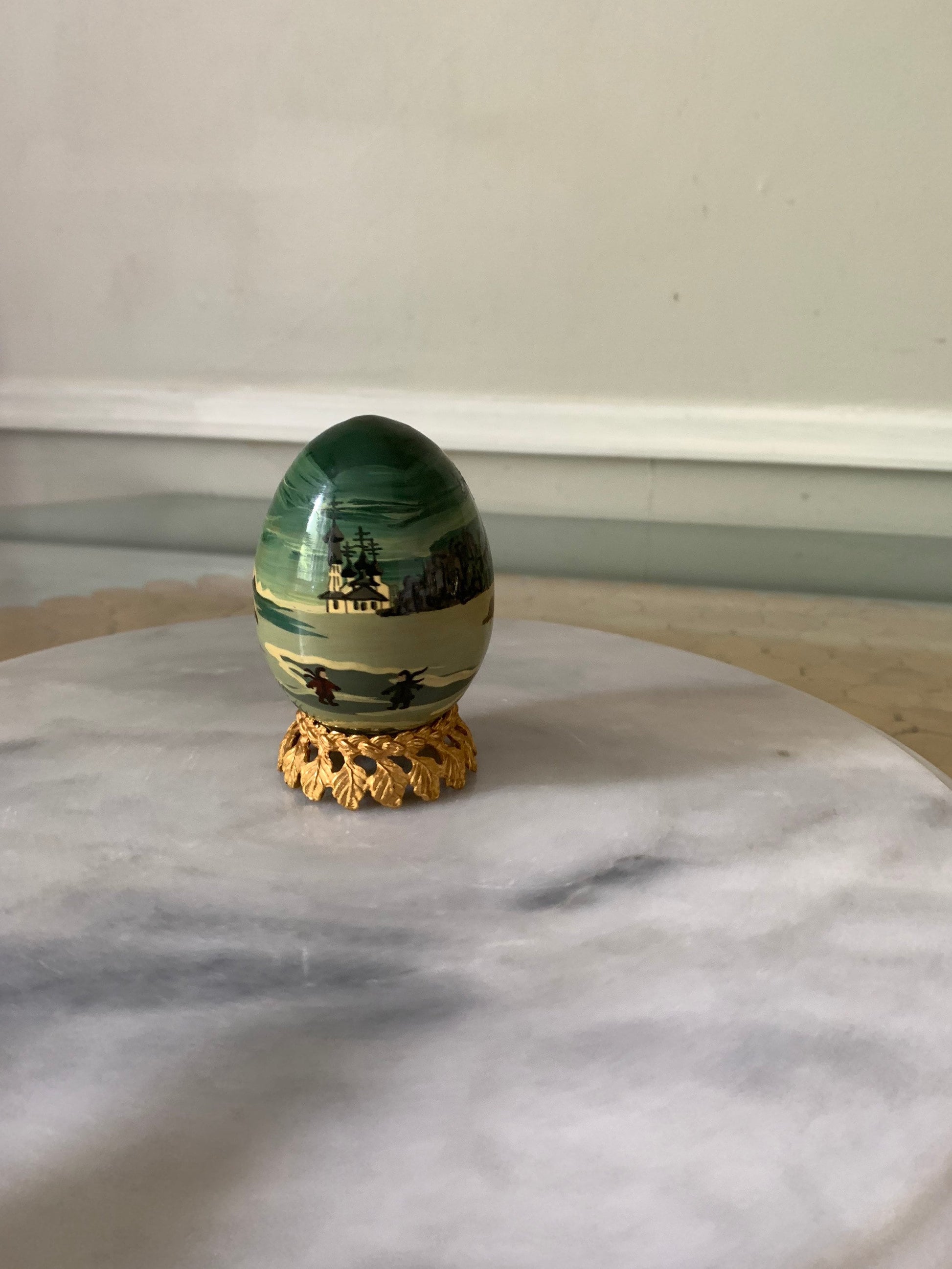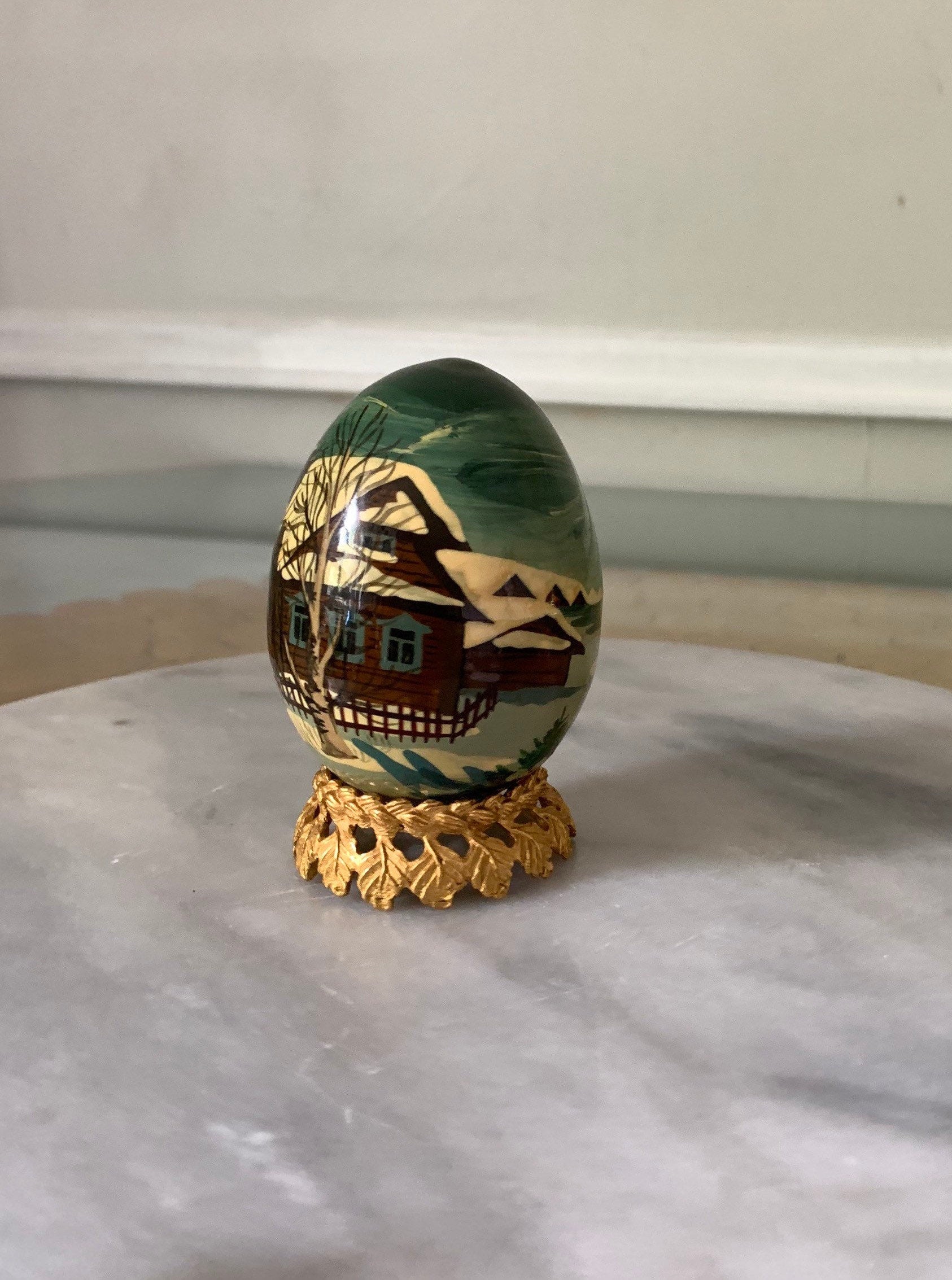 Hand Painted Wooden Egg with a Winter Scene and Brass Stand
