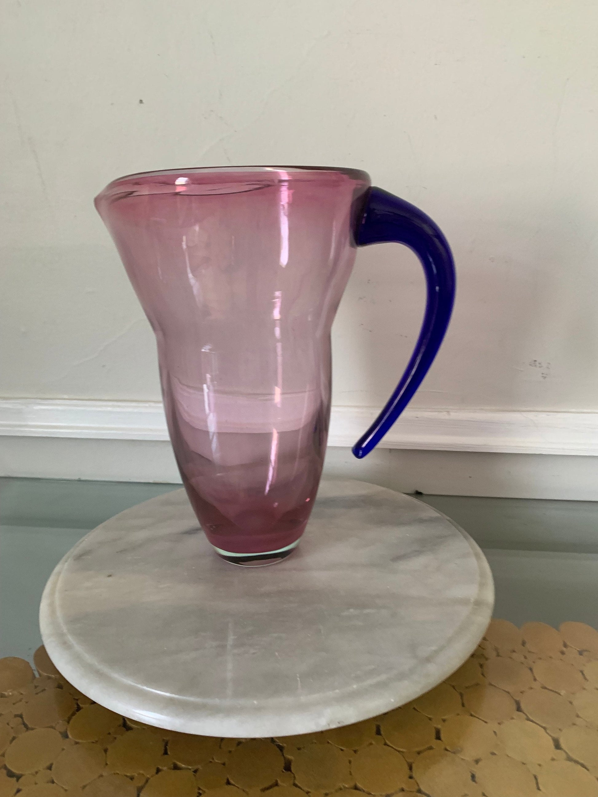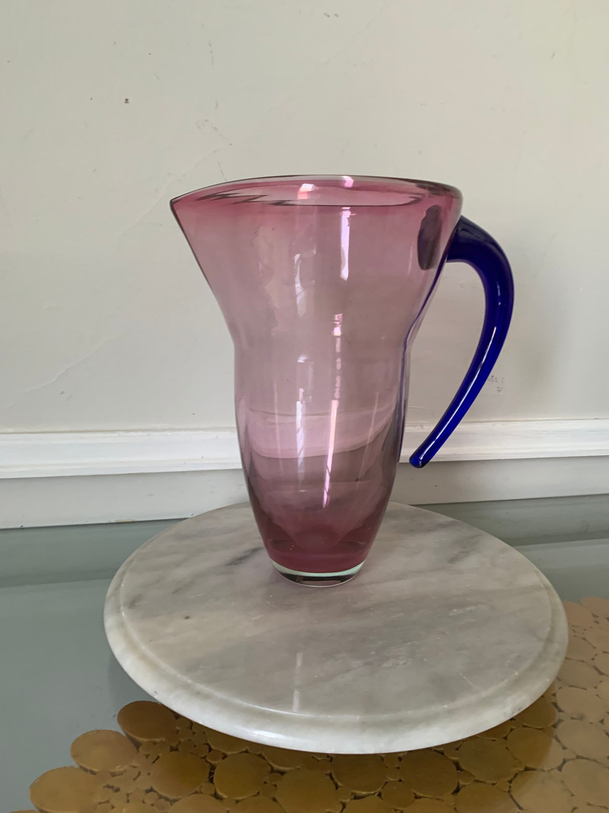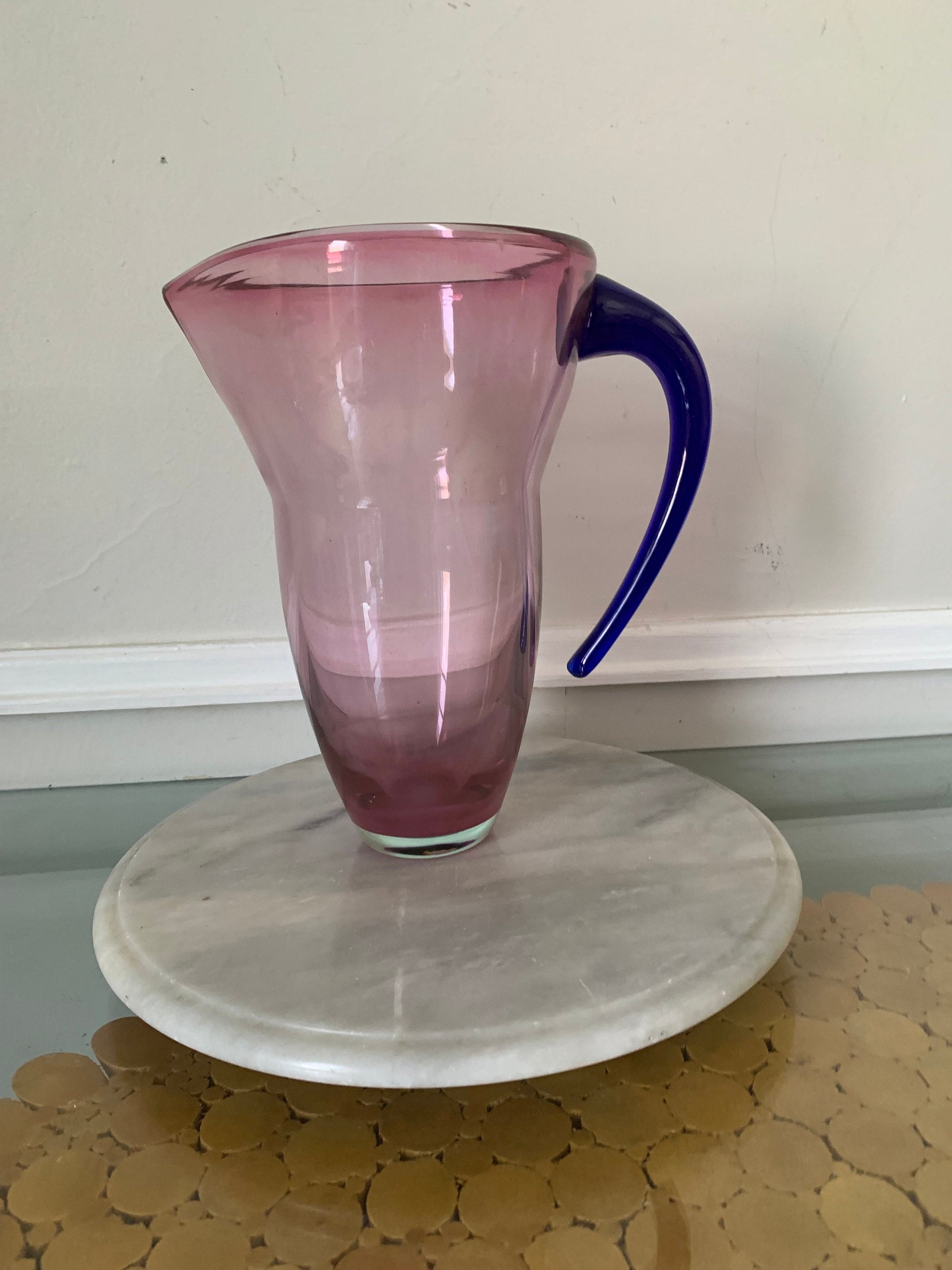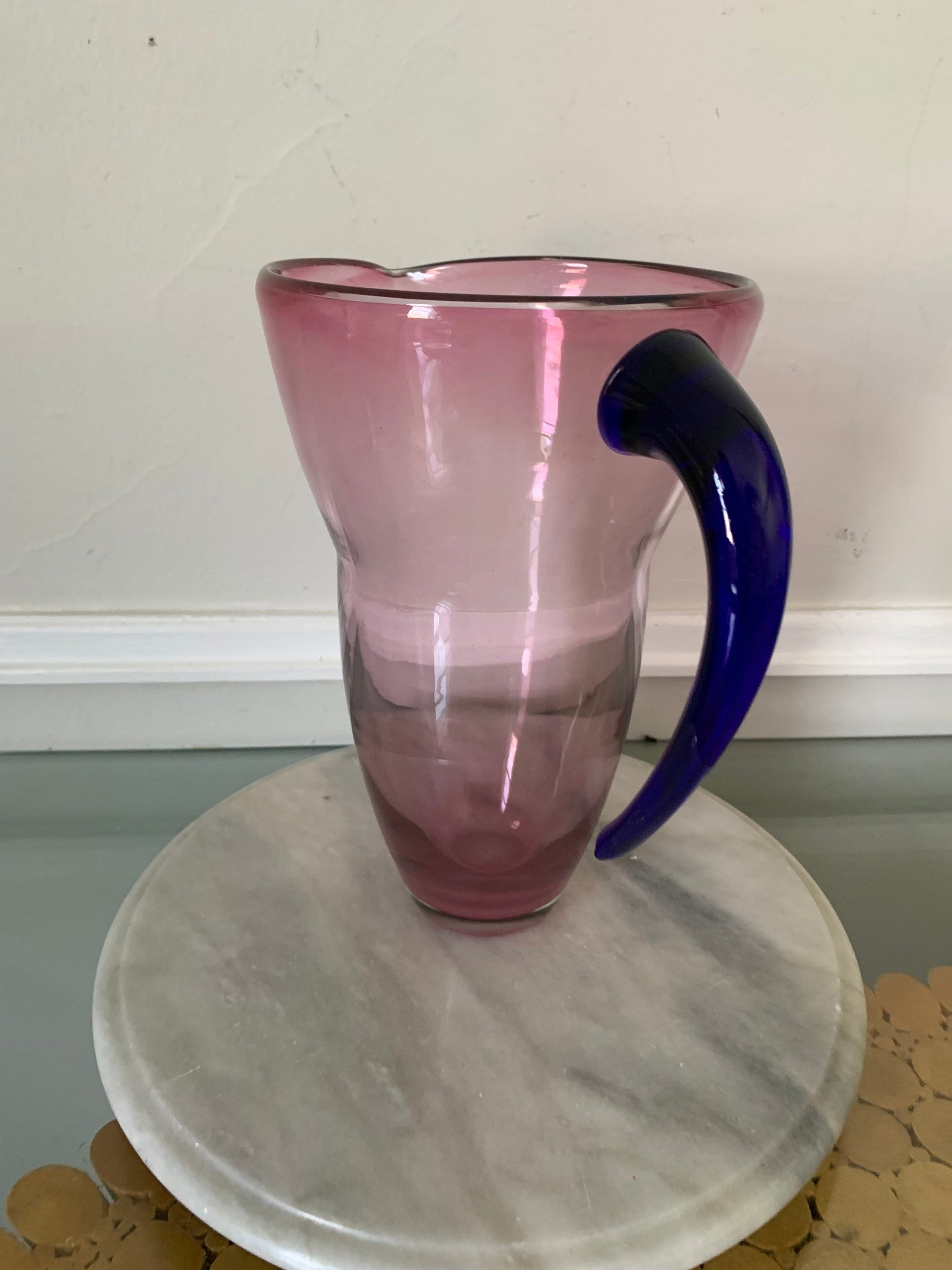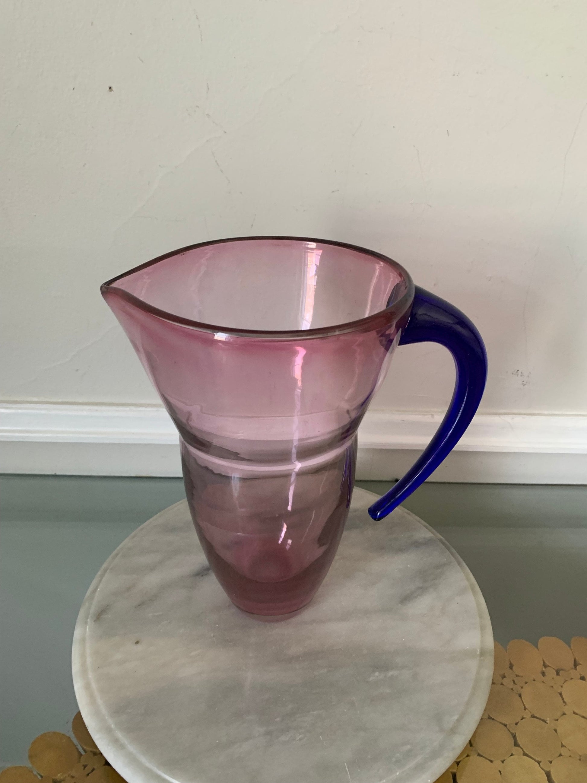 Handmade Clear Pink Glass Pitcher with Cobalt Blue Handle