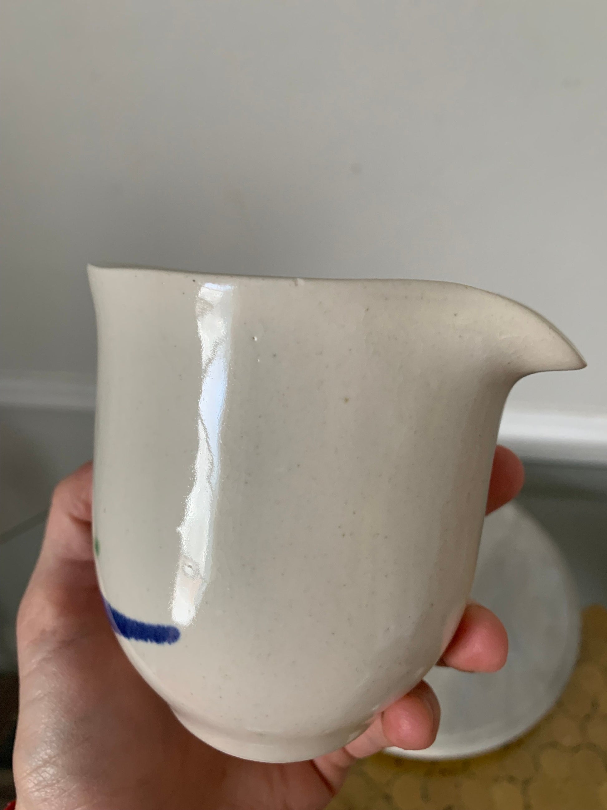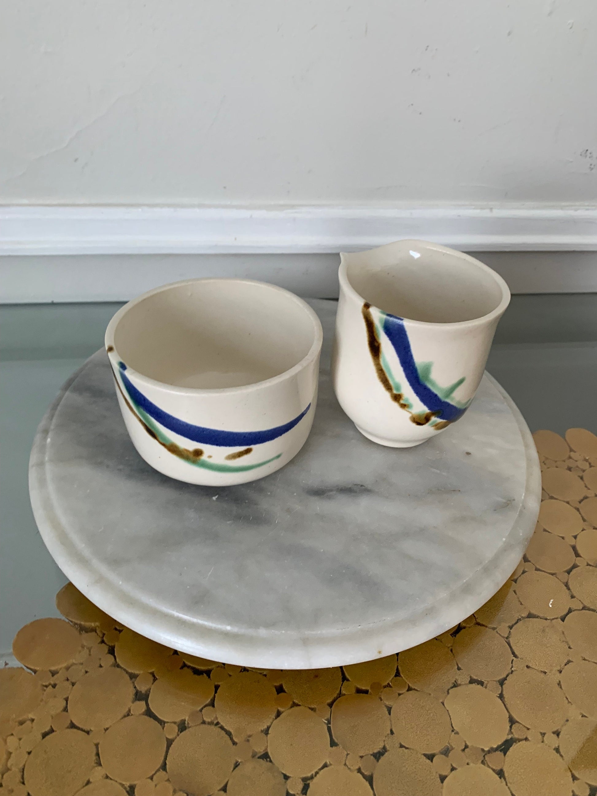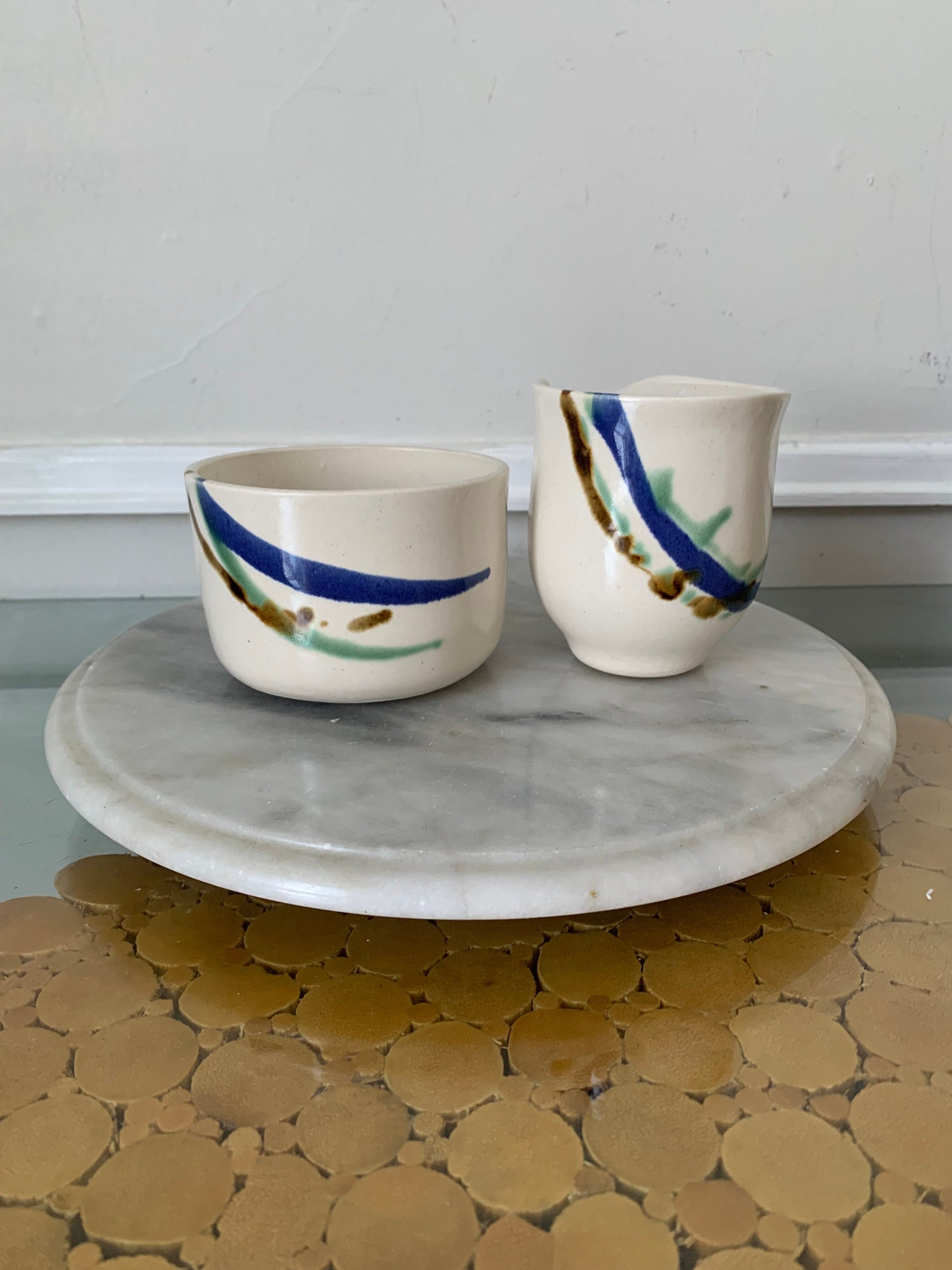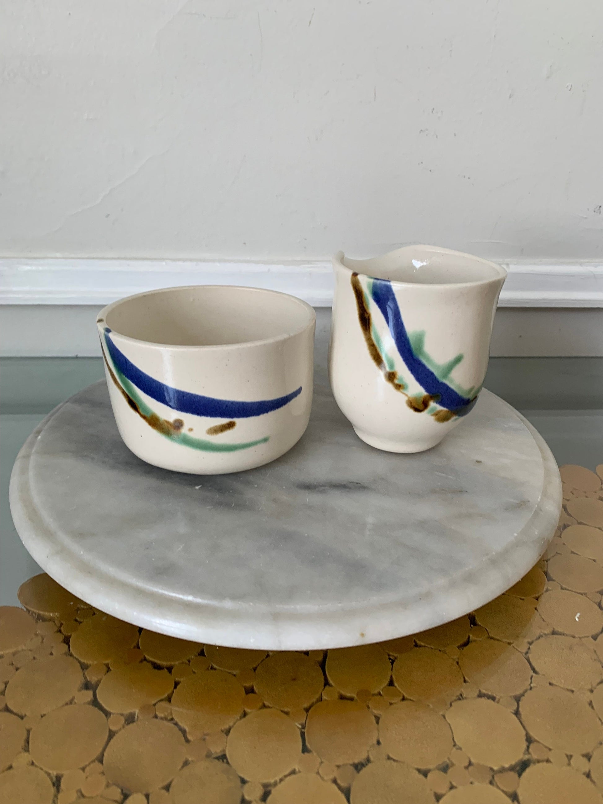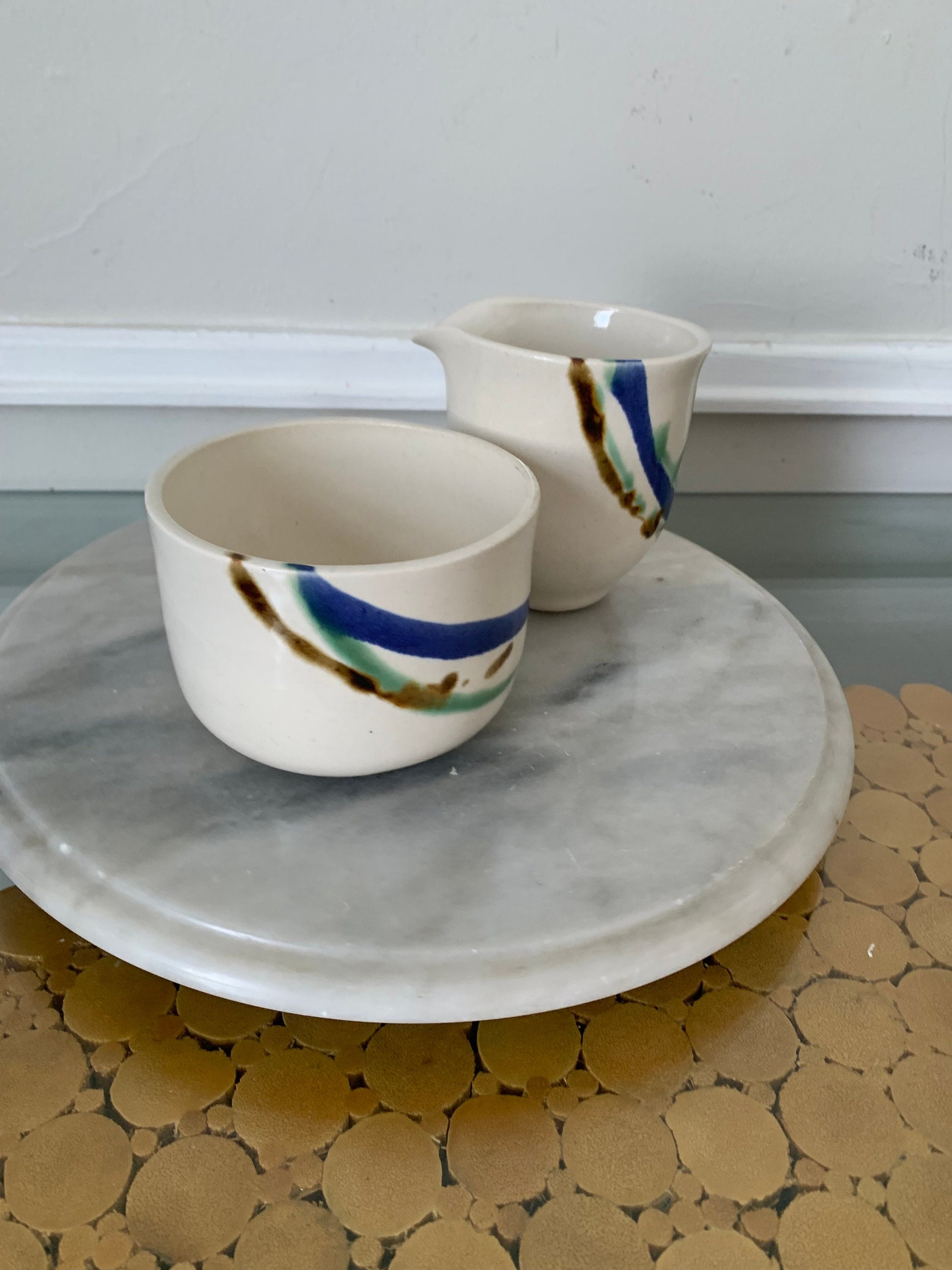 Handmade Cream Pottery with Jade and Cobalt Stripe Cream and Sugar Set