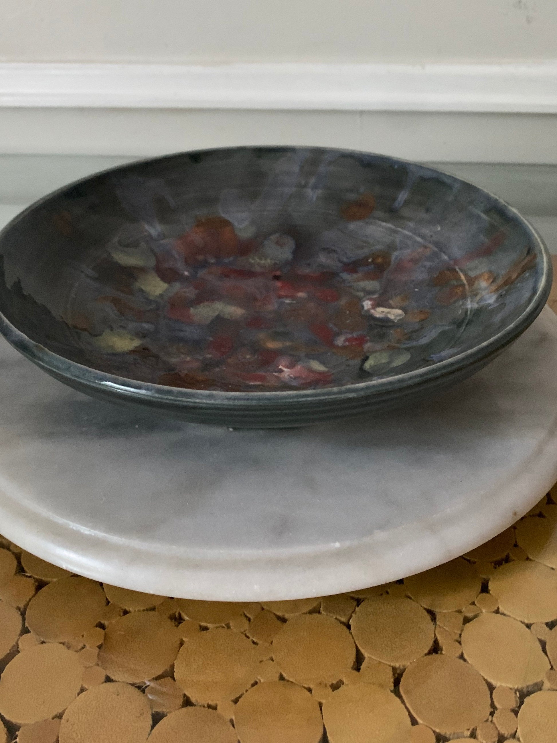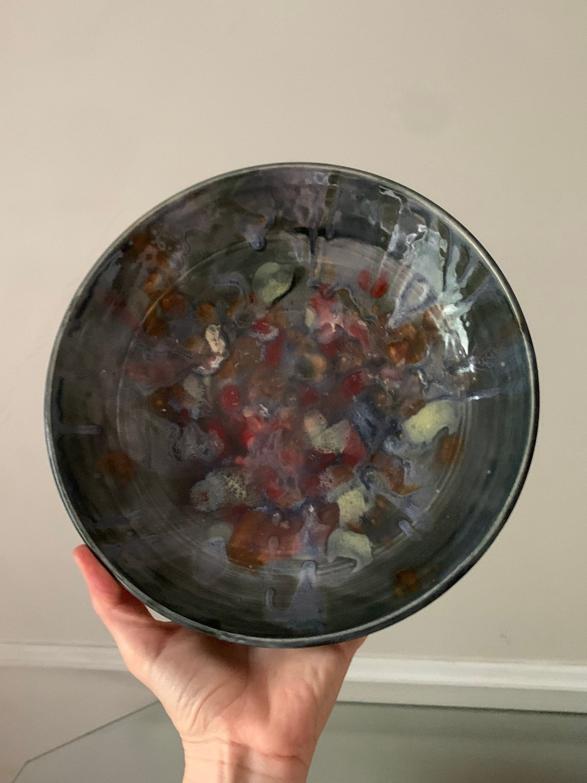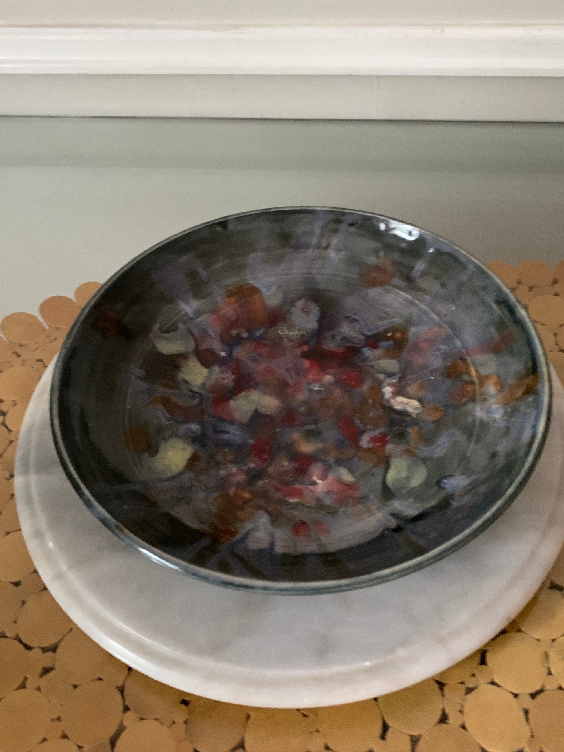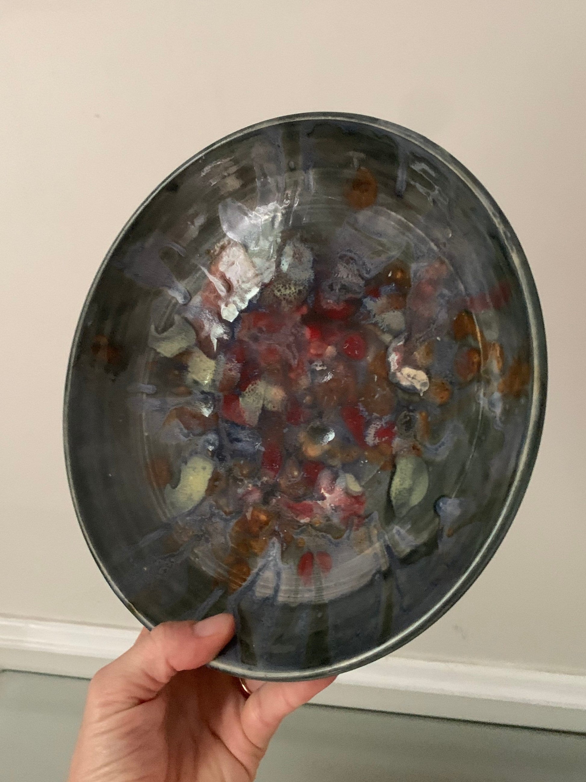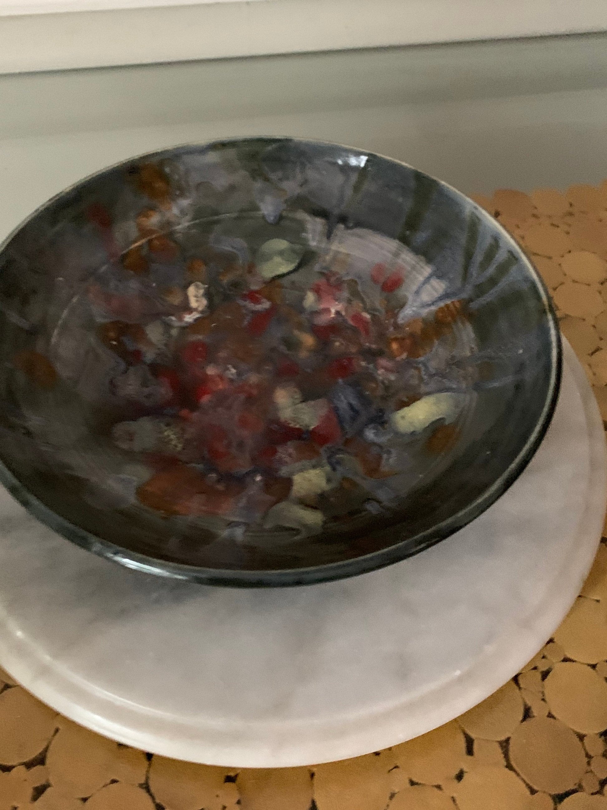 Gorgeous colourful pottery bowl that would look beautiful in any number of places.