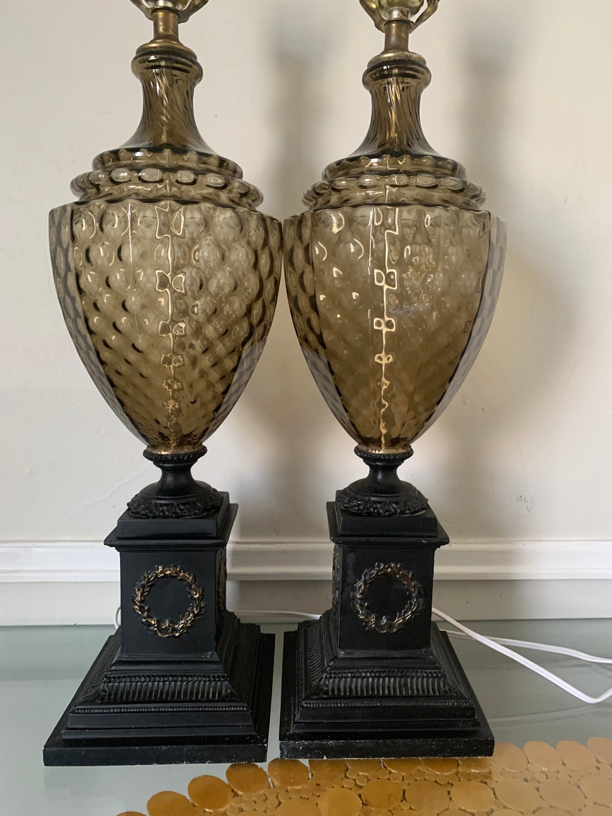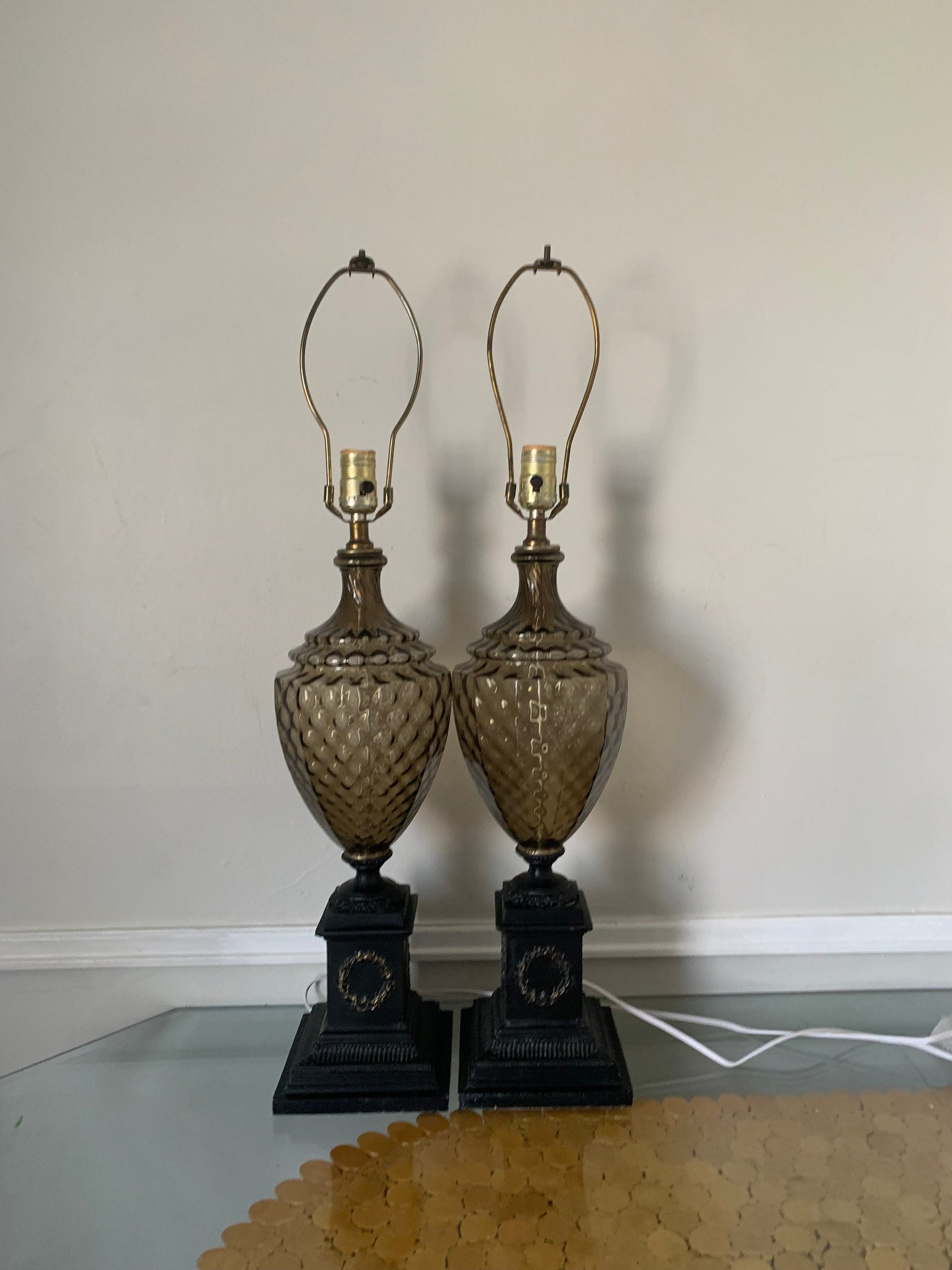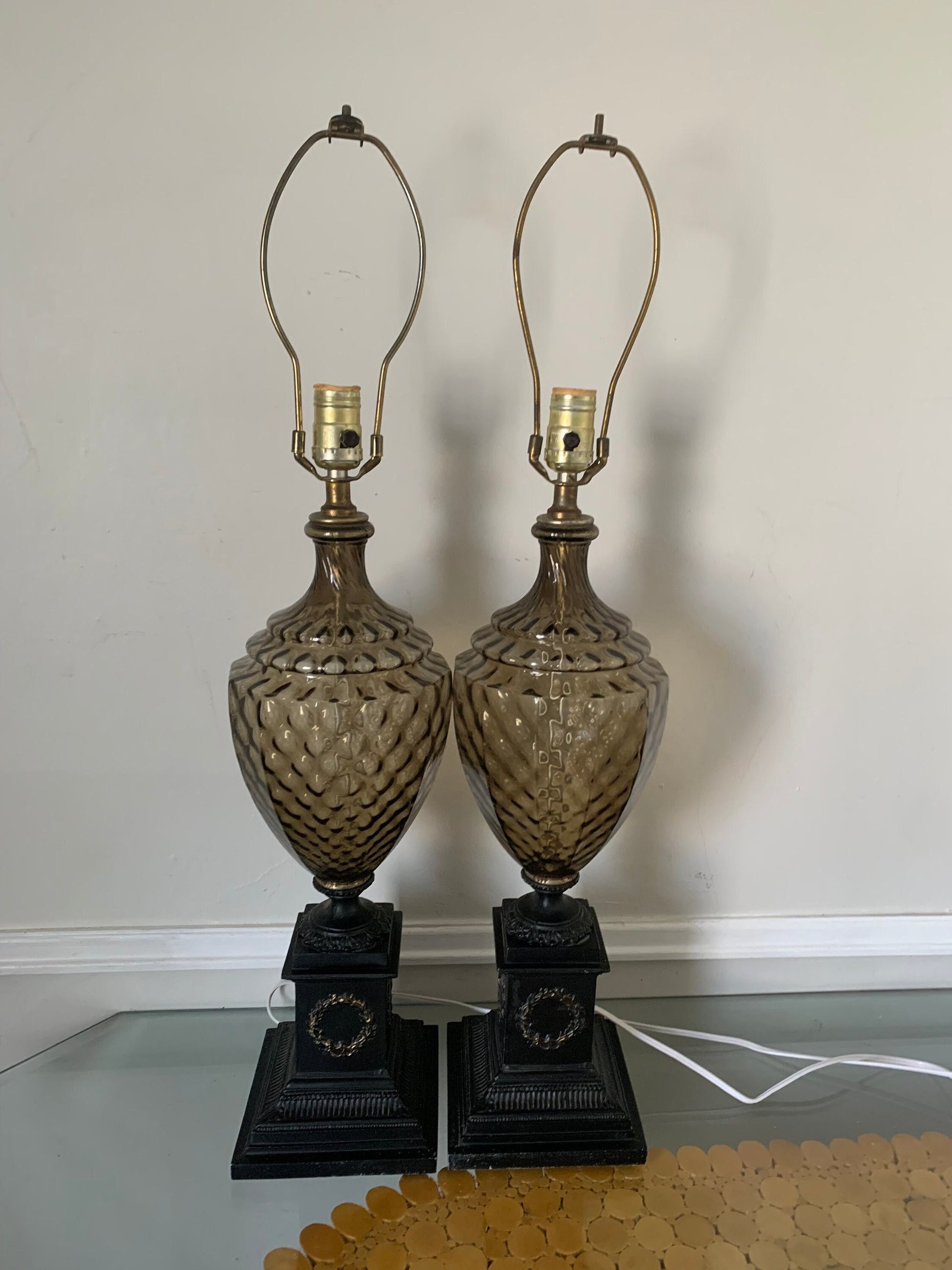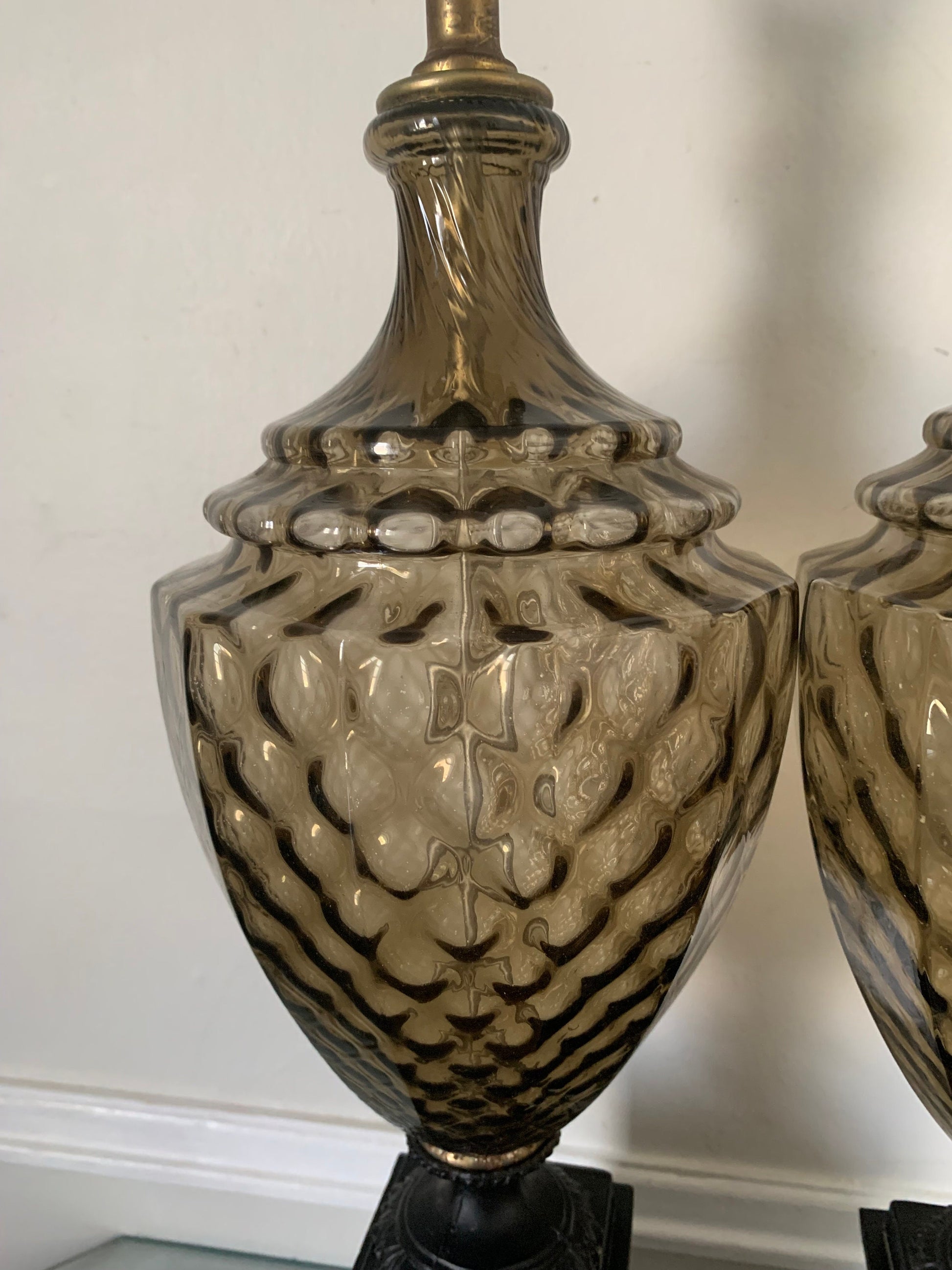 Pair of MCM Vintage Smokey Topaz Glass and Brass Table Lamps No Shades