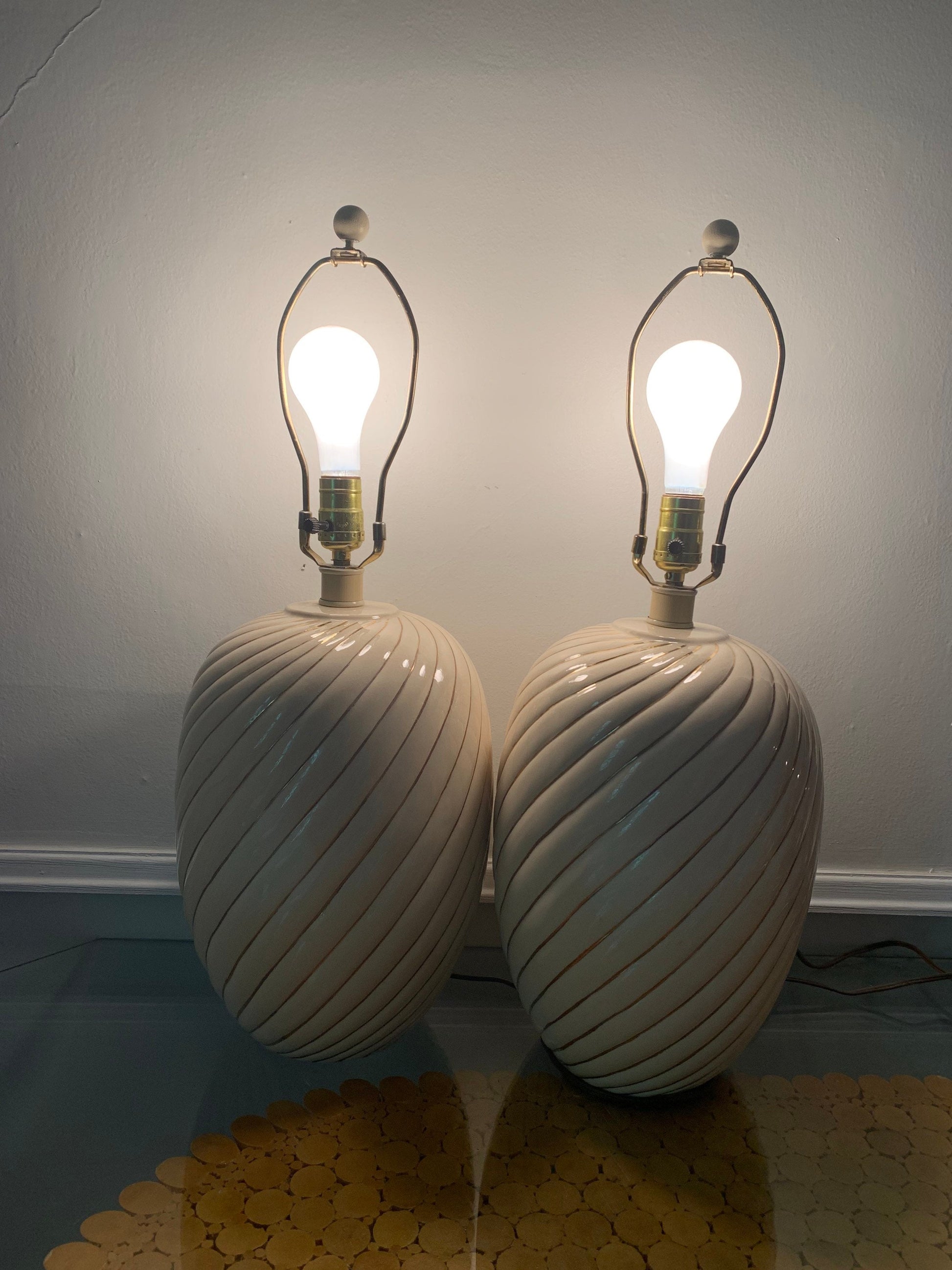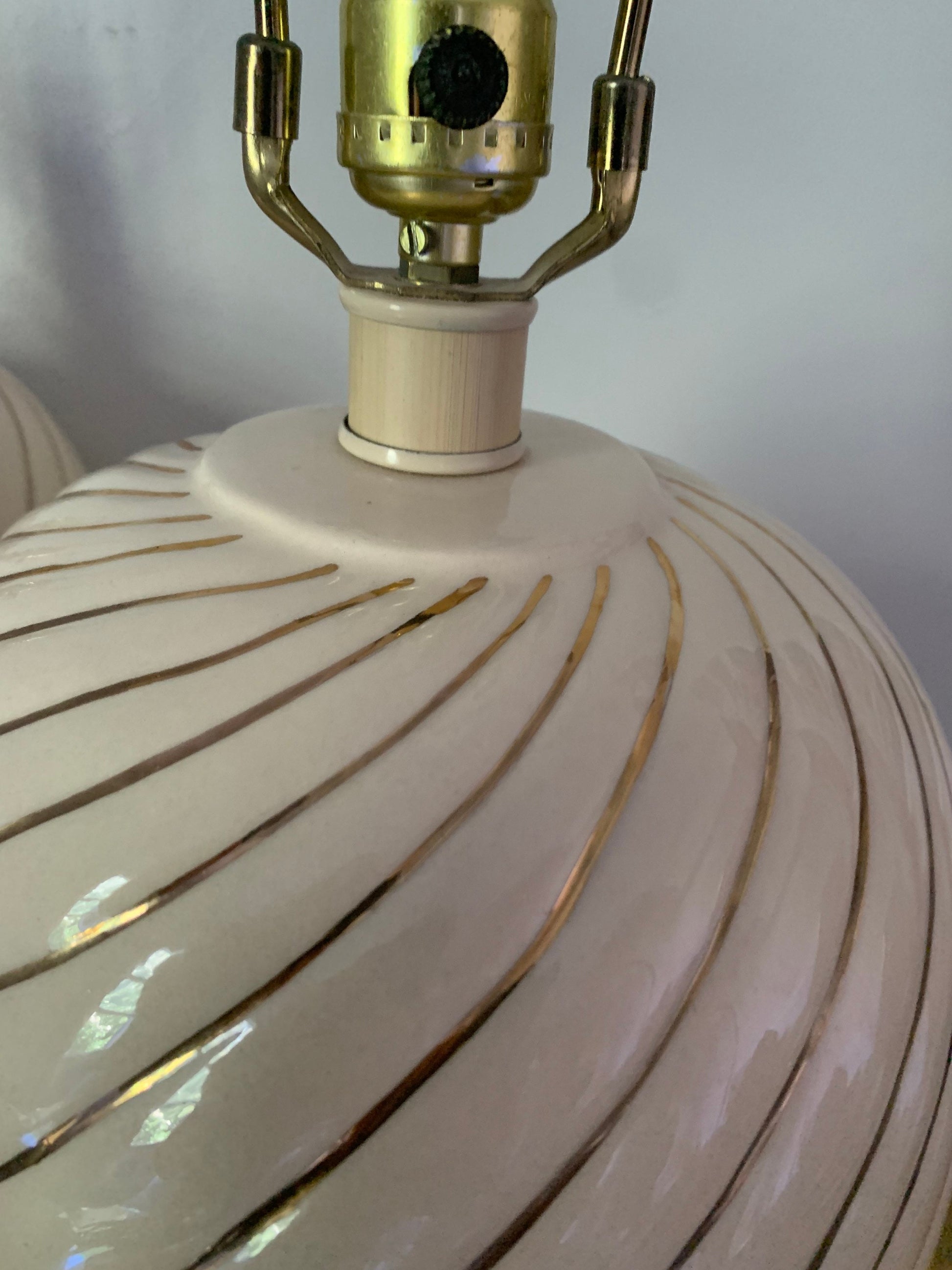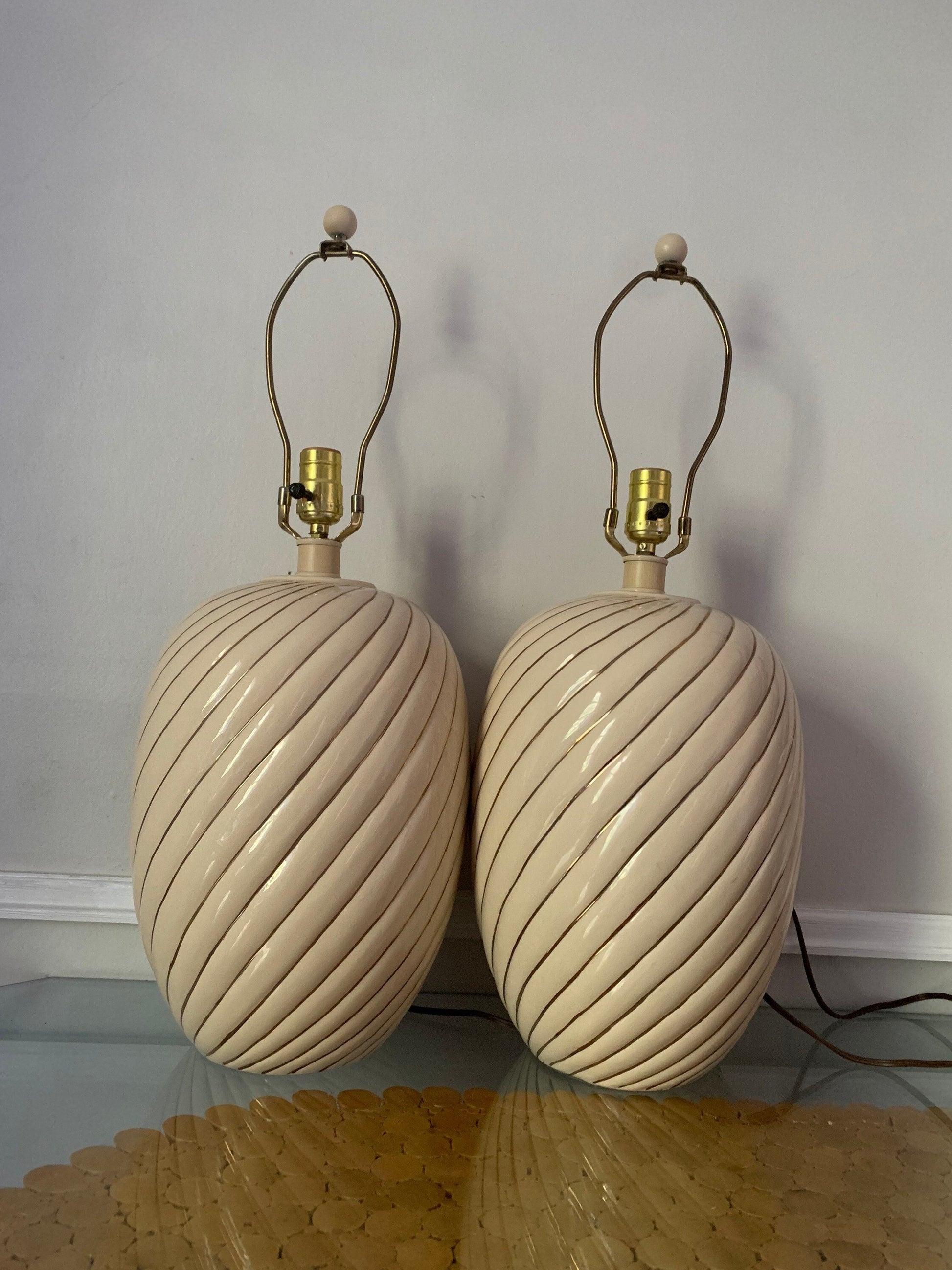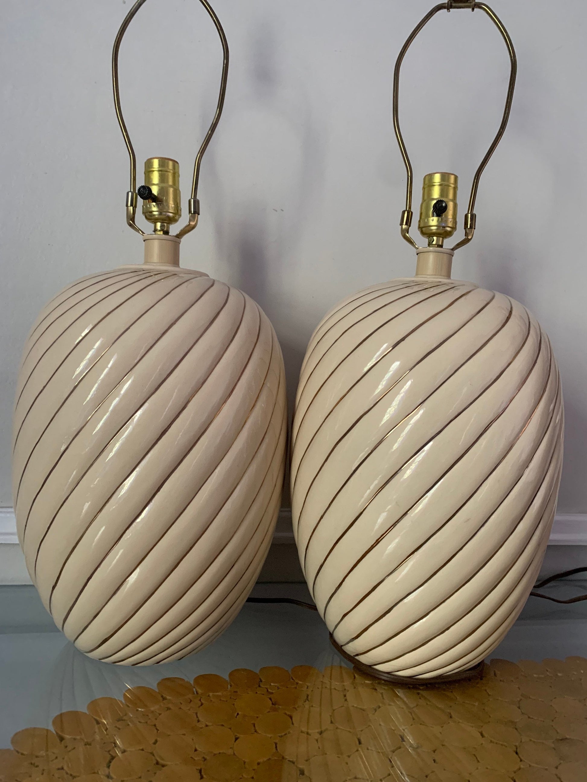Pair of Retro Large Cream and Gold Striped Ceramic Lamp No Shades
