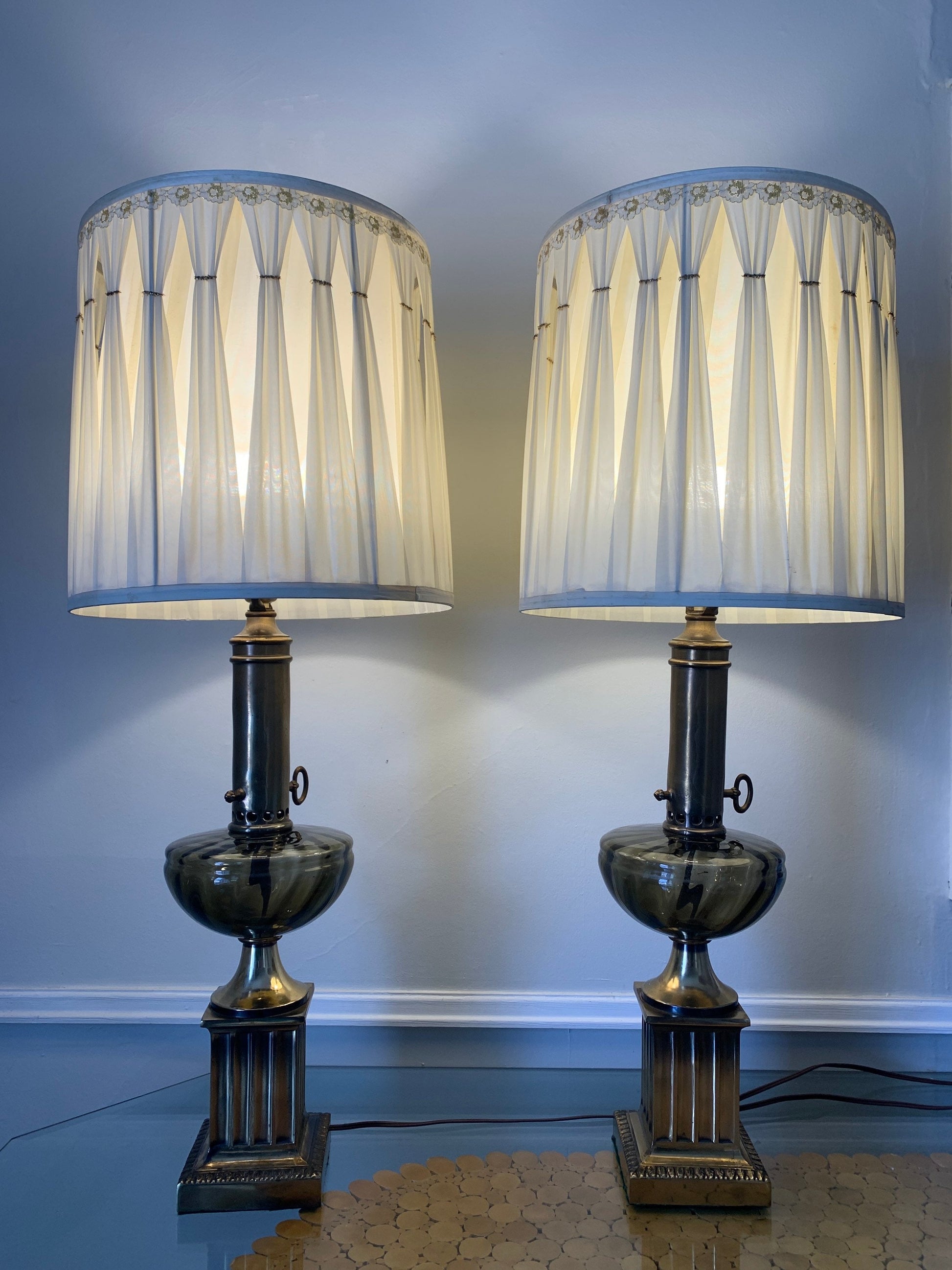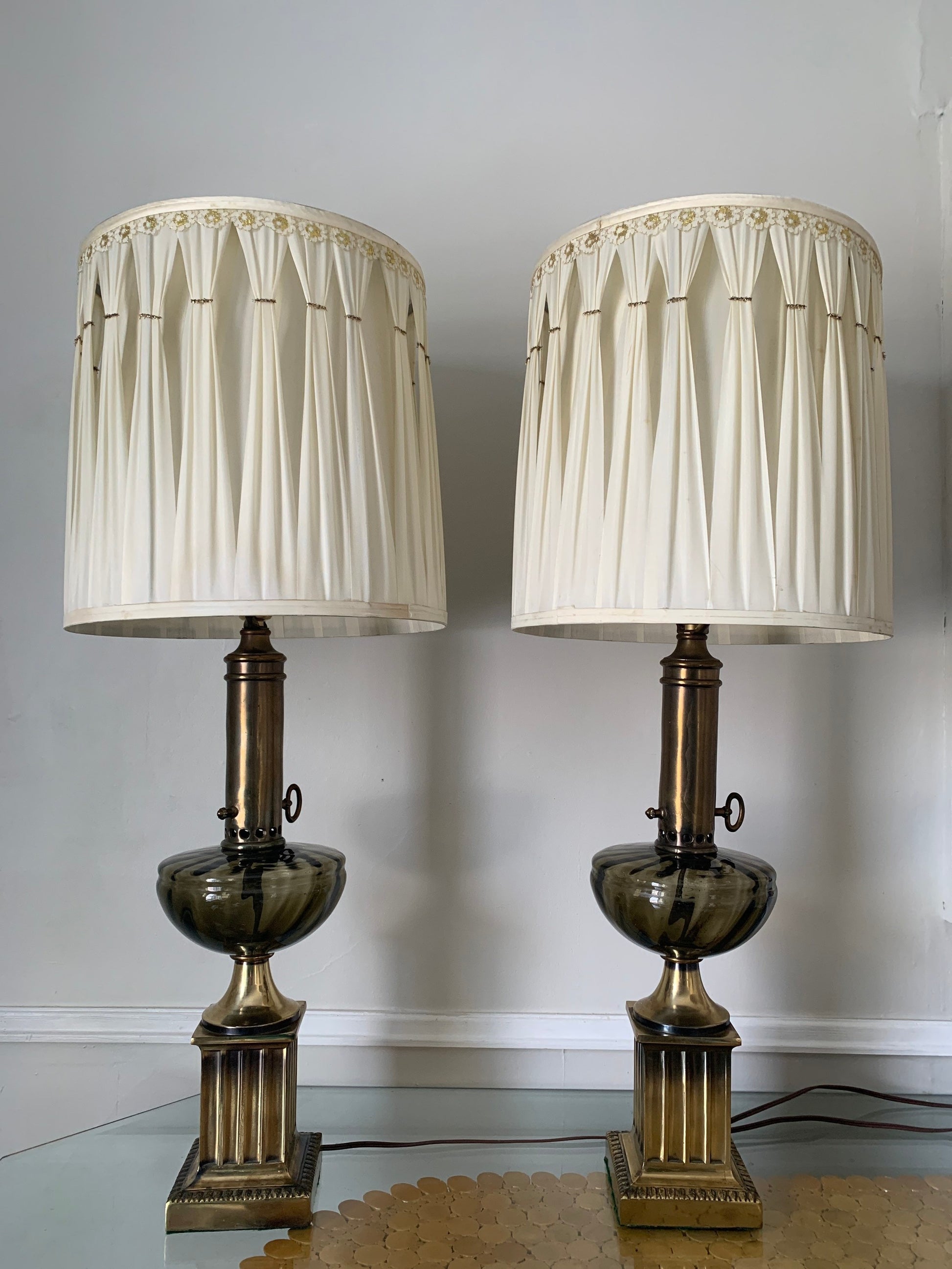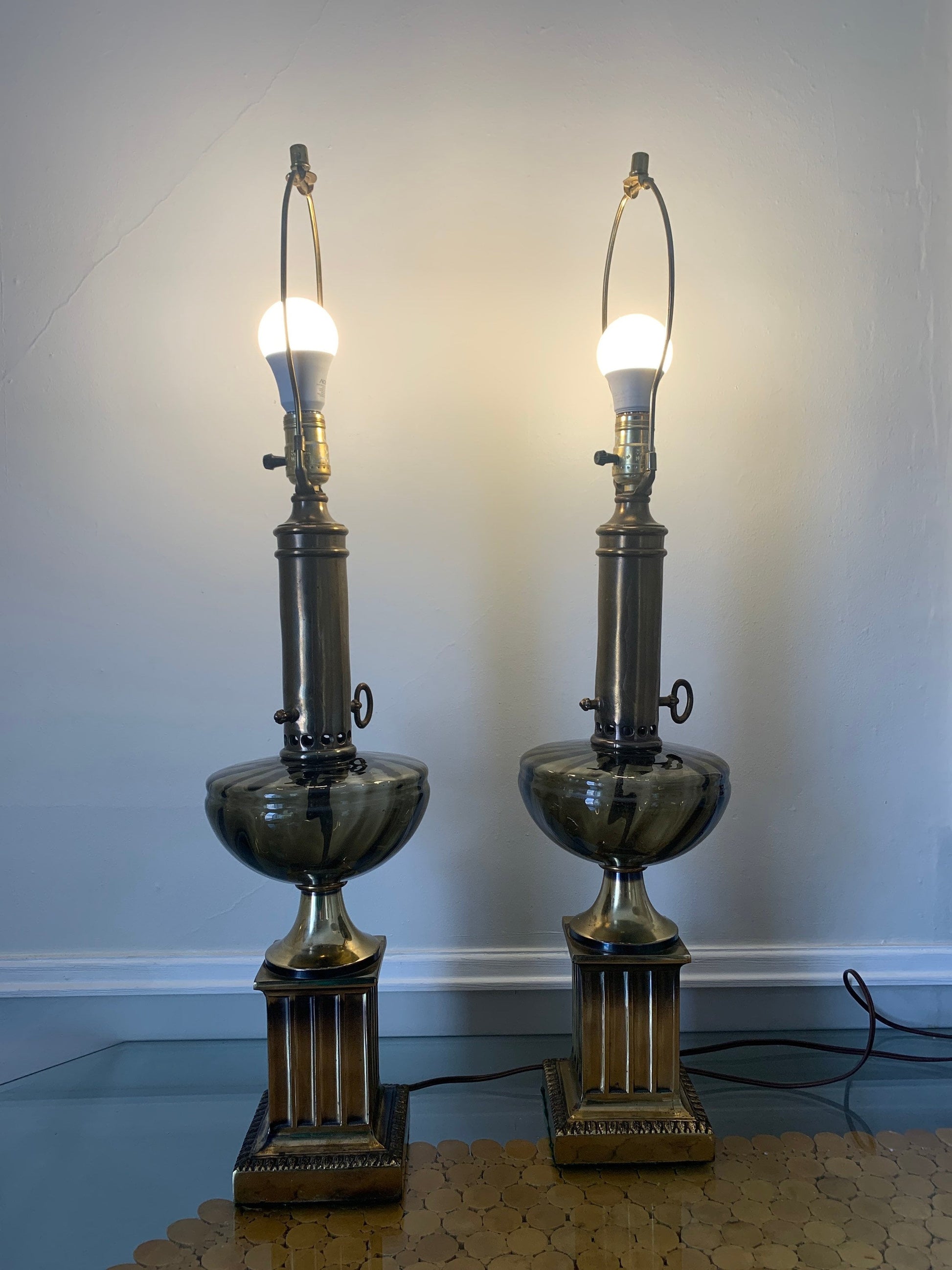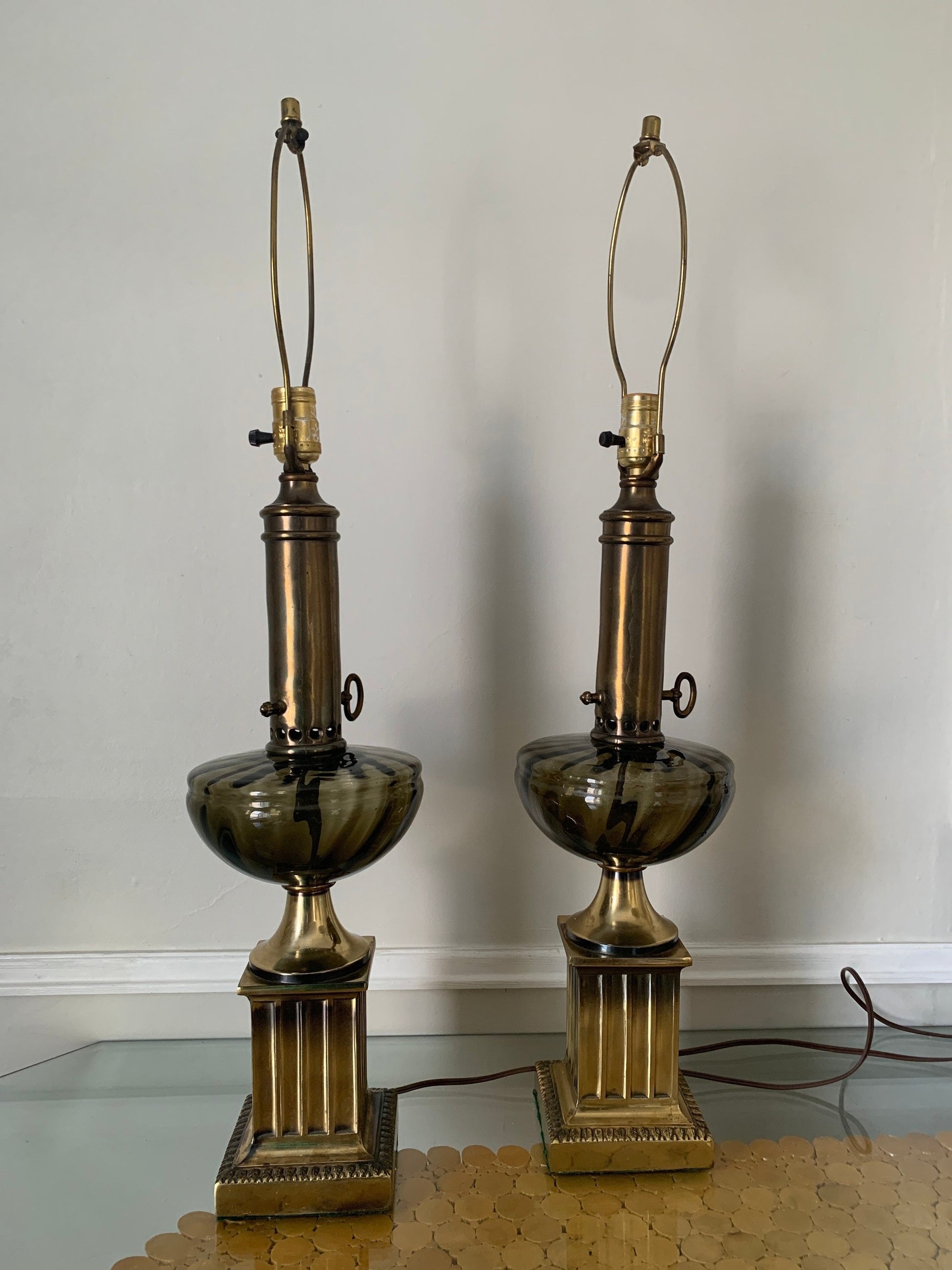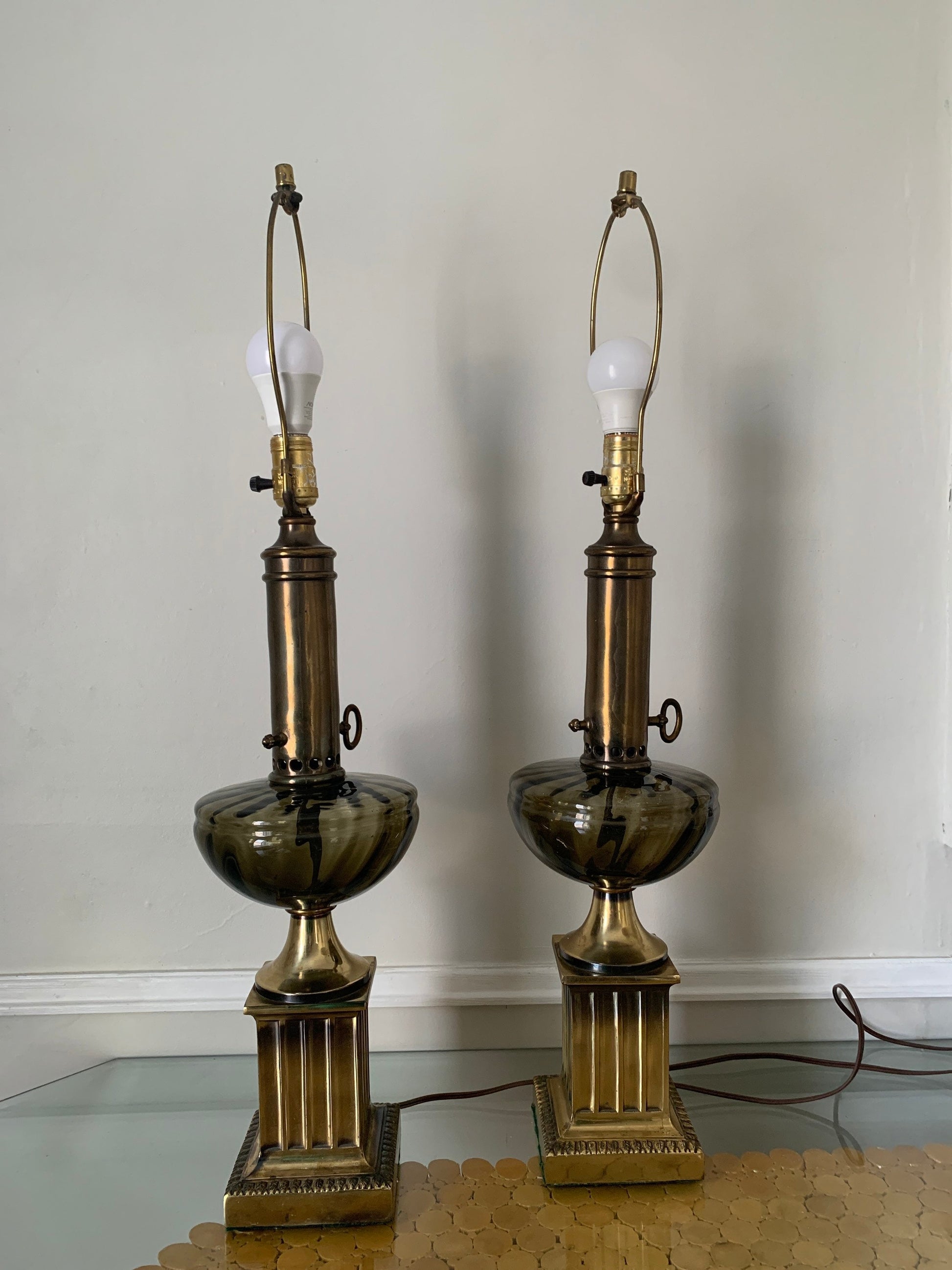Pair of Tall Vintage Smokey Topaz Glass and Brass Table Lamps No Shades