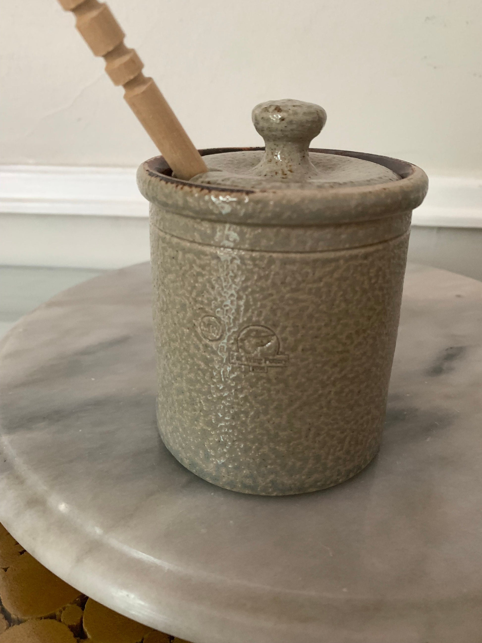 Retro Handmade Red Wing Pottery Jar with Blue Beet and Wooden Honey Stick
