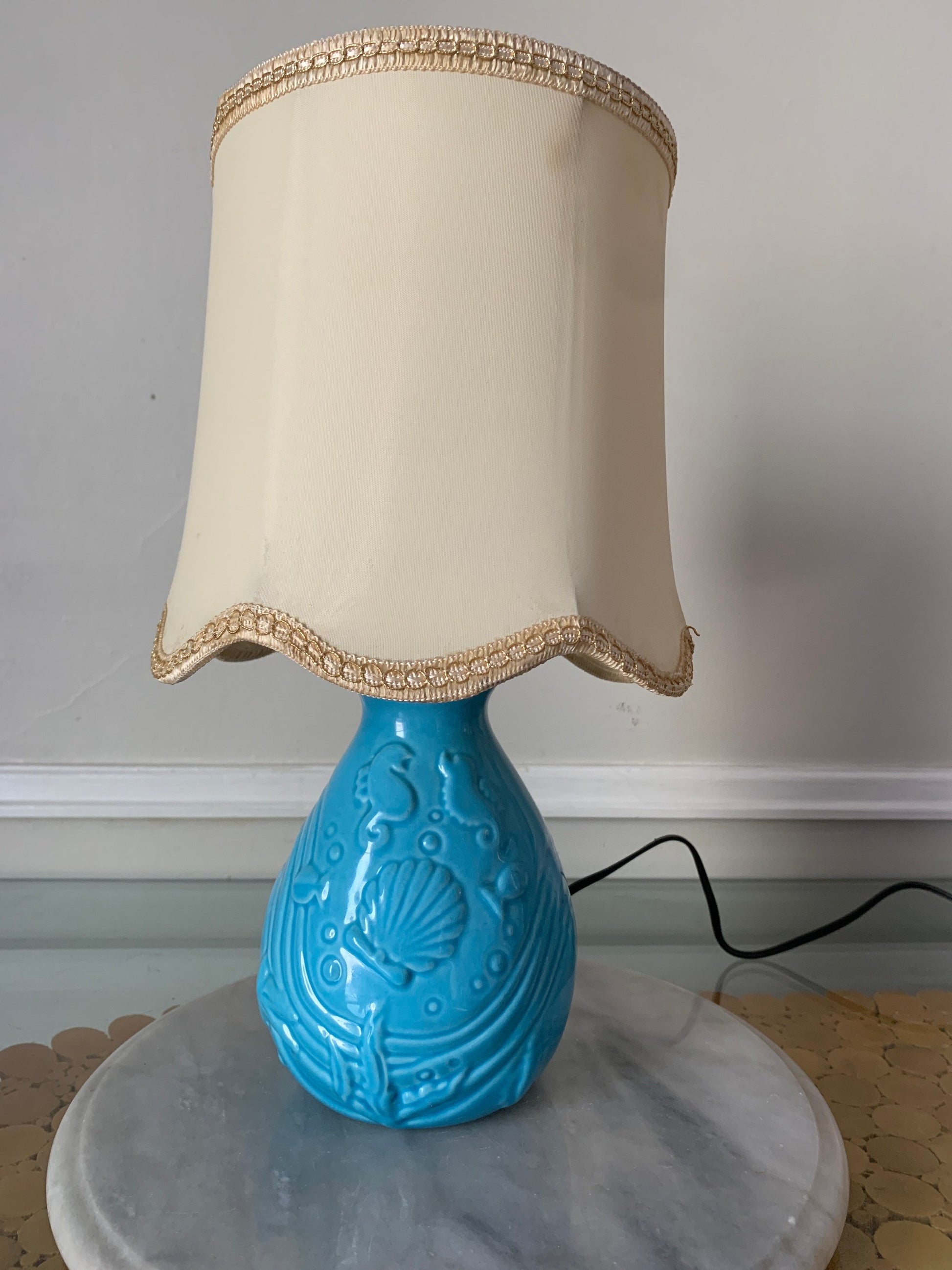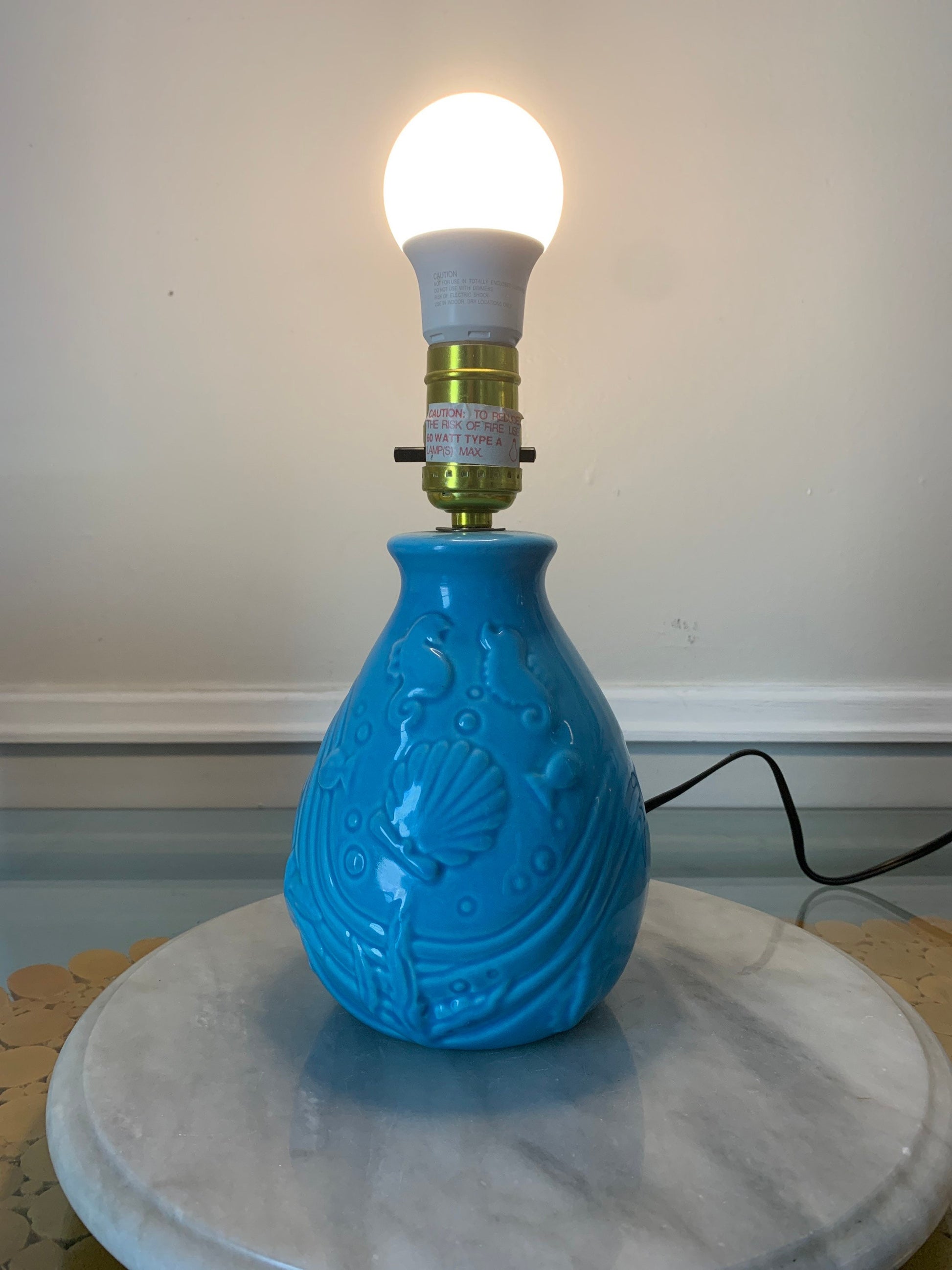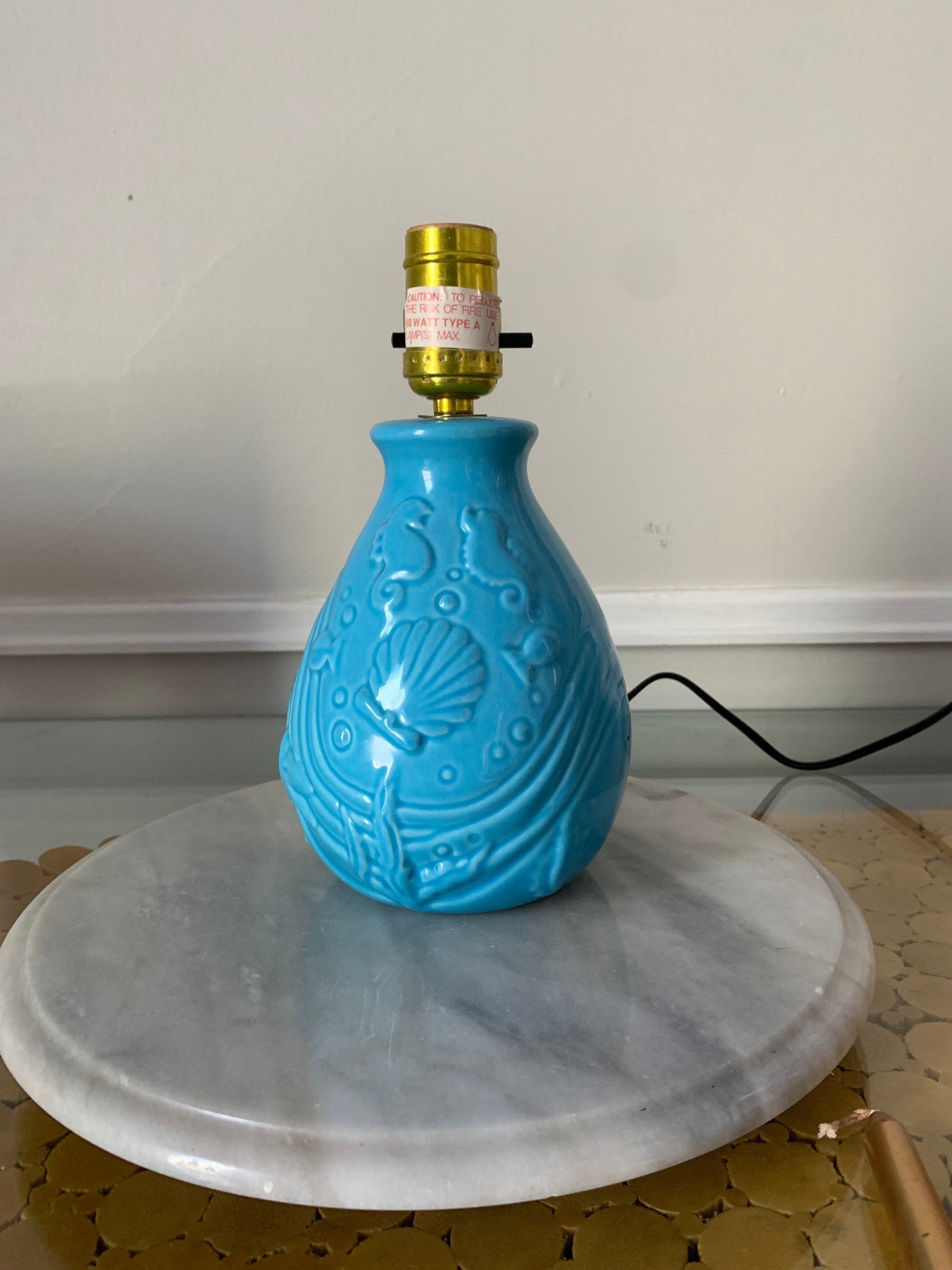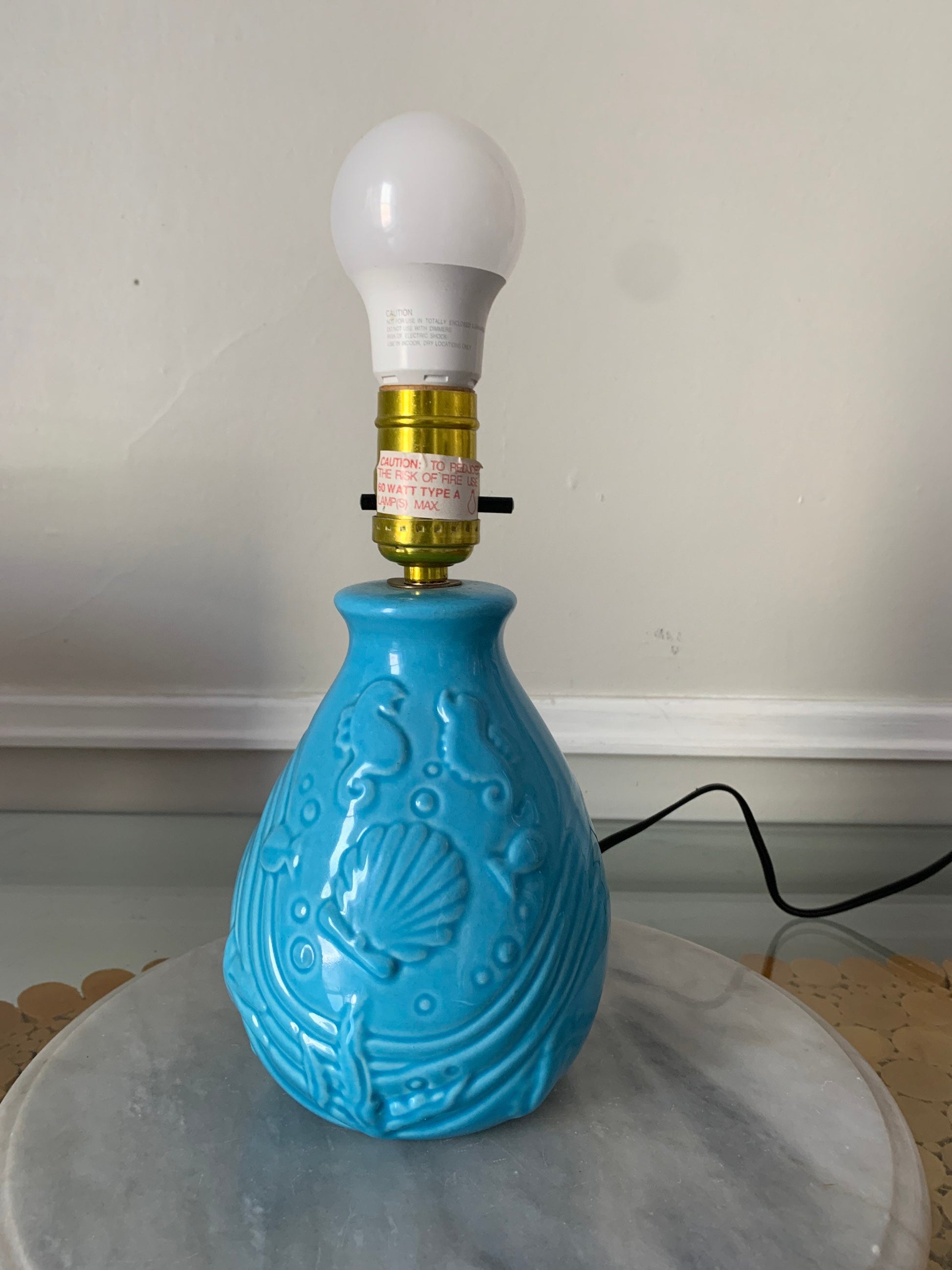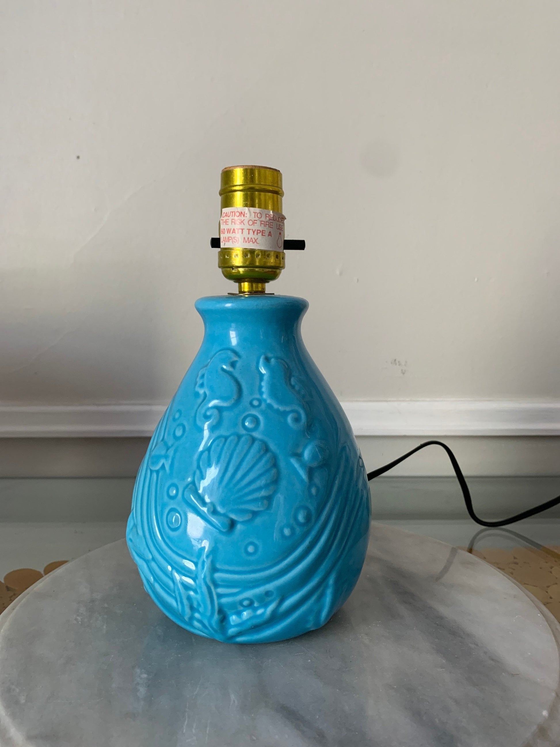 A wee little lamp with a lot going on - 2 sea horses, 2 fish, one clam and one sea star to be exact.
