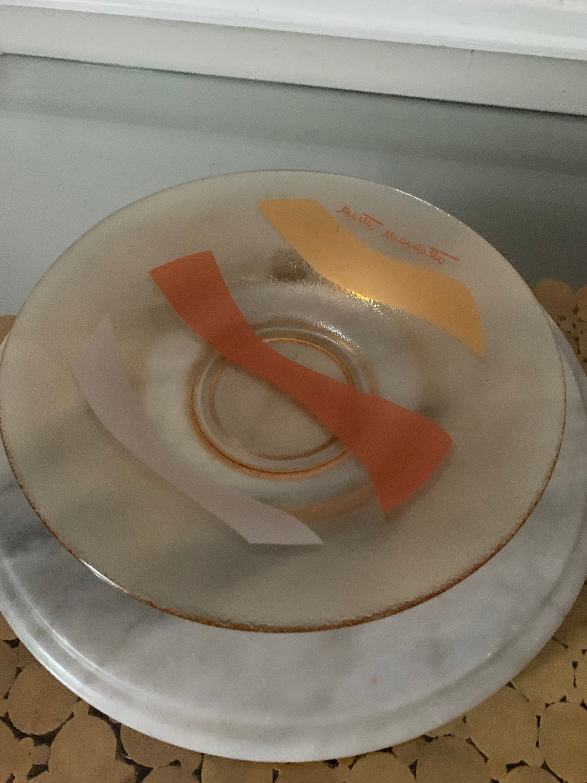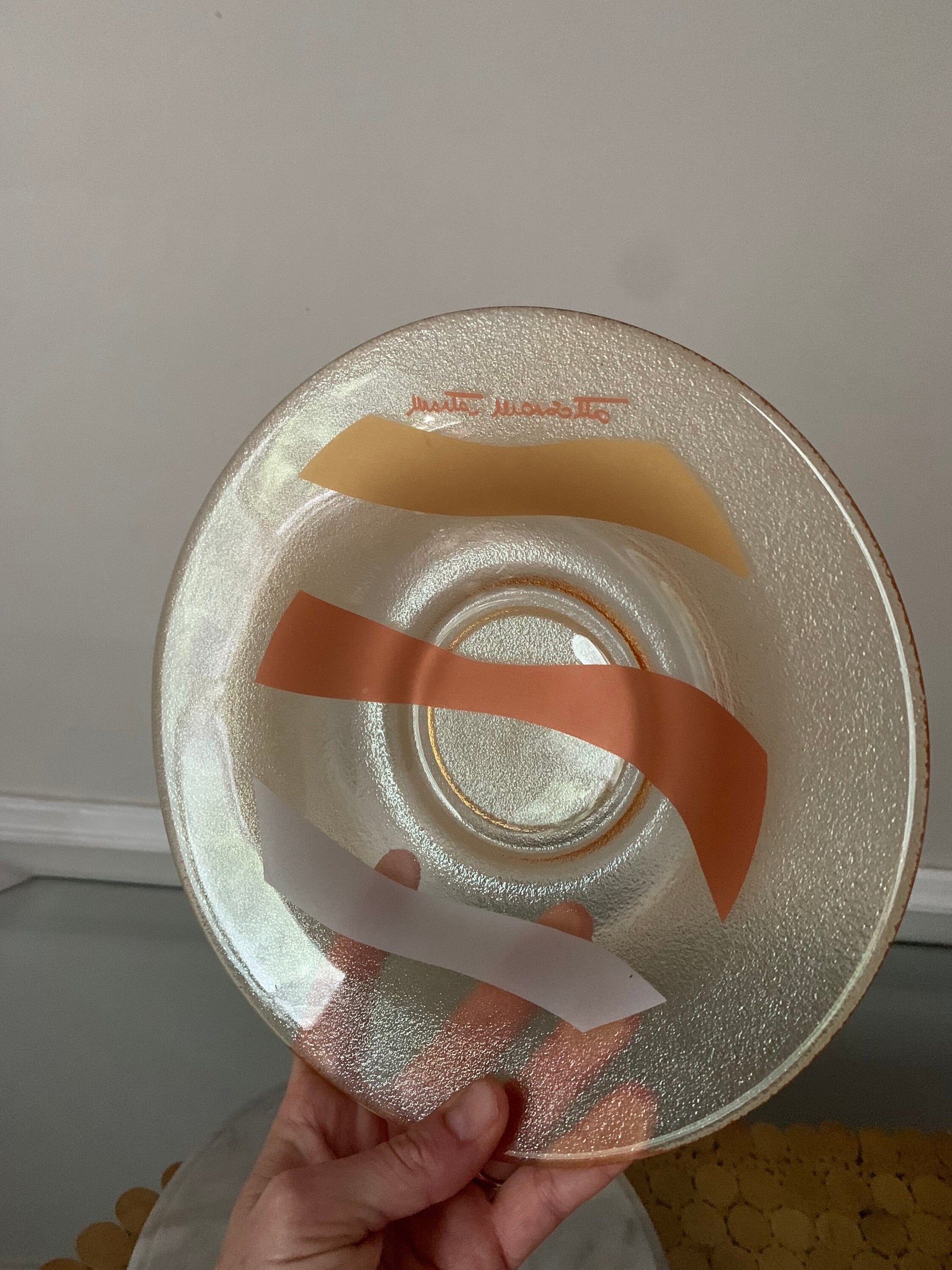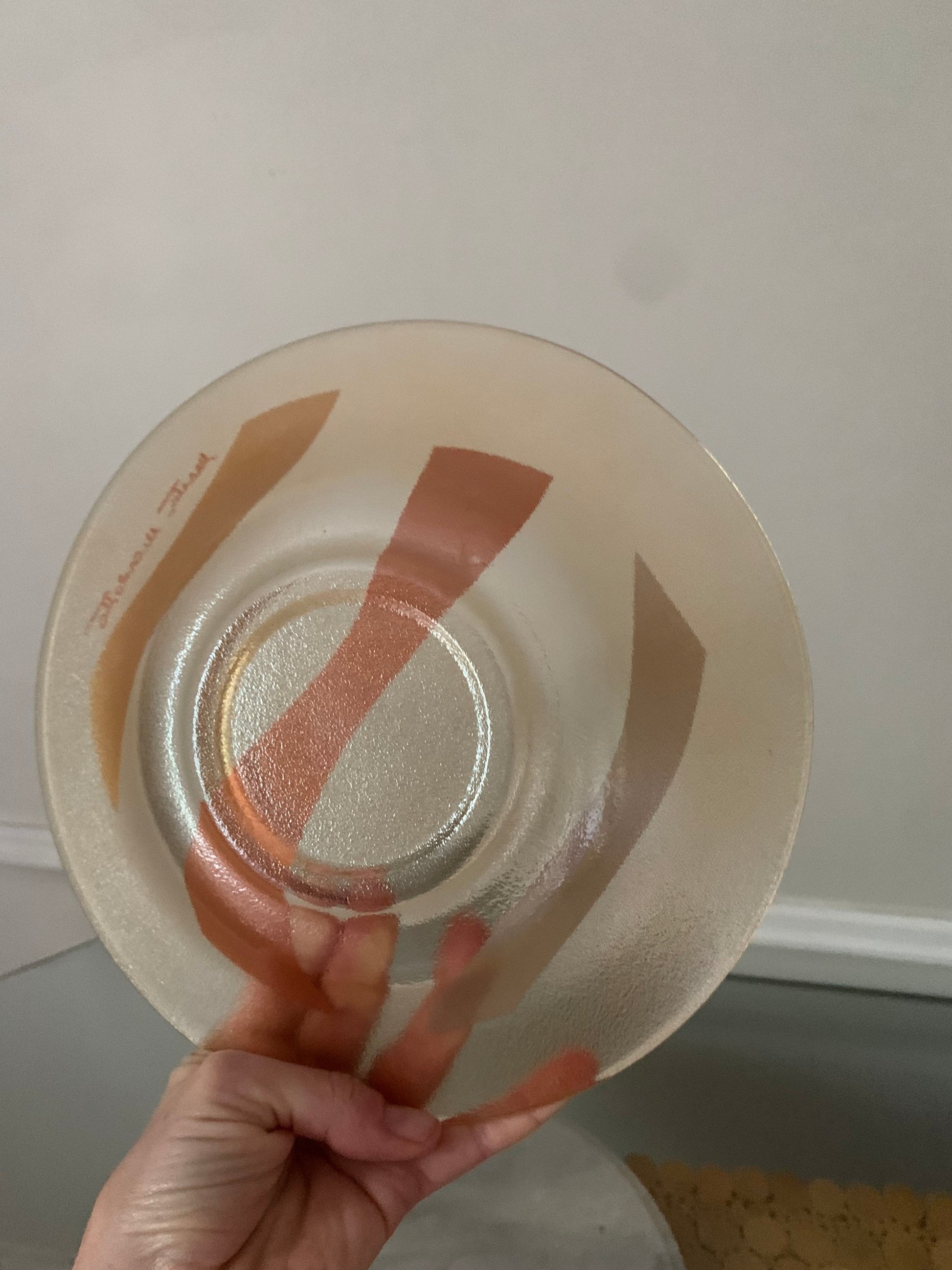This bowl is so cool and has a lot going on. The outside is textured glass with a peach lustre finished. The inside has three frosted, metallic swipes with a signature.