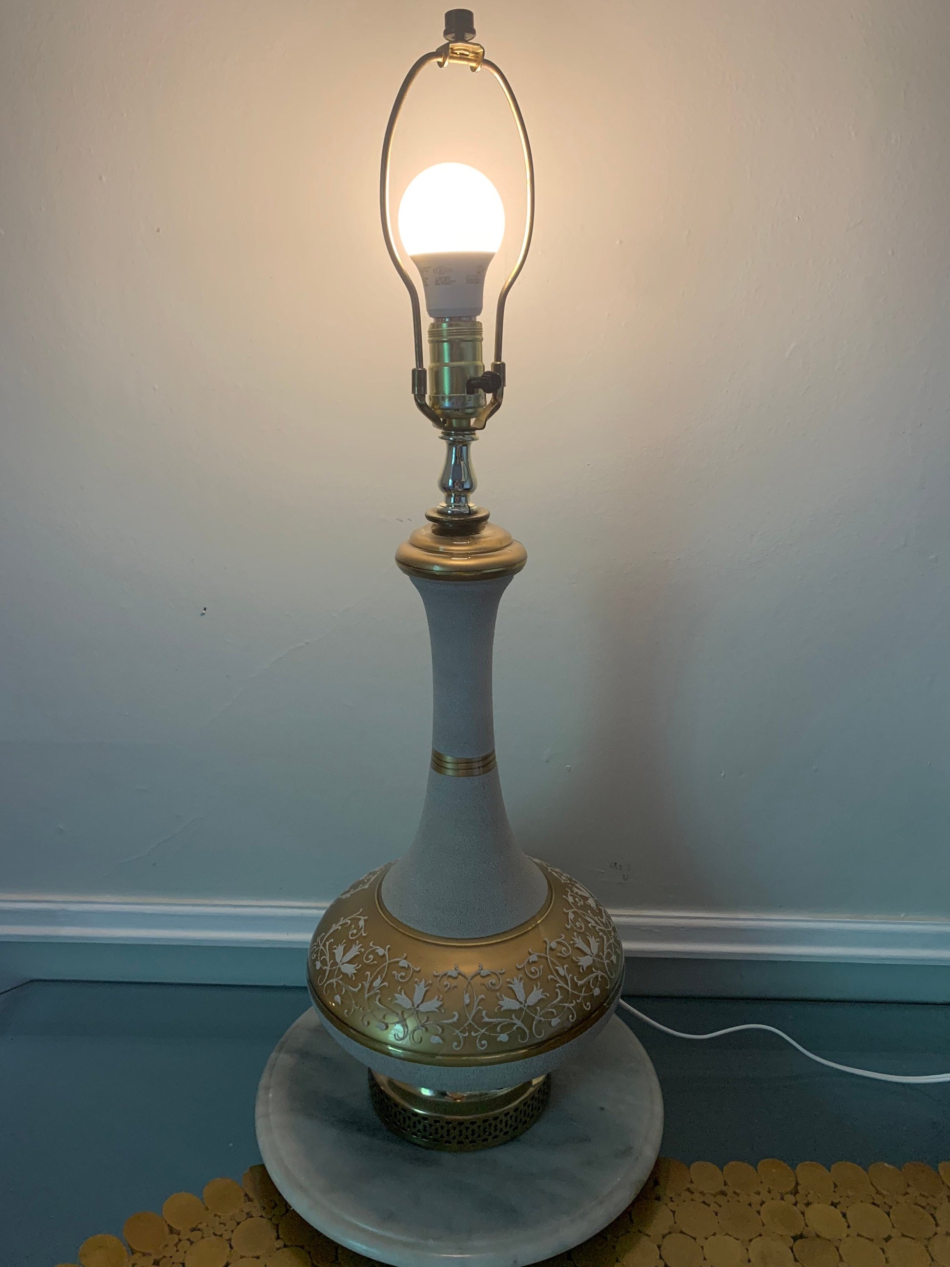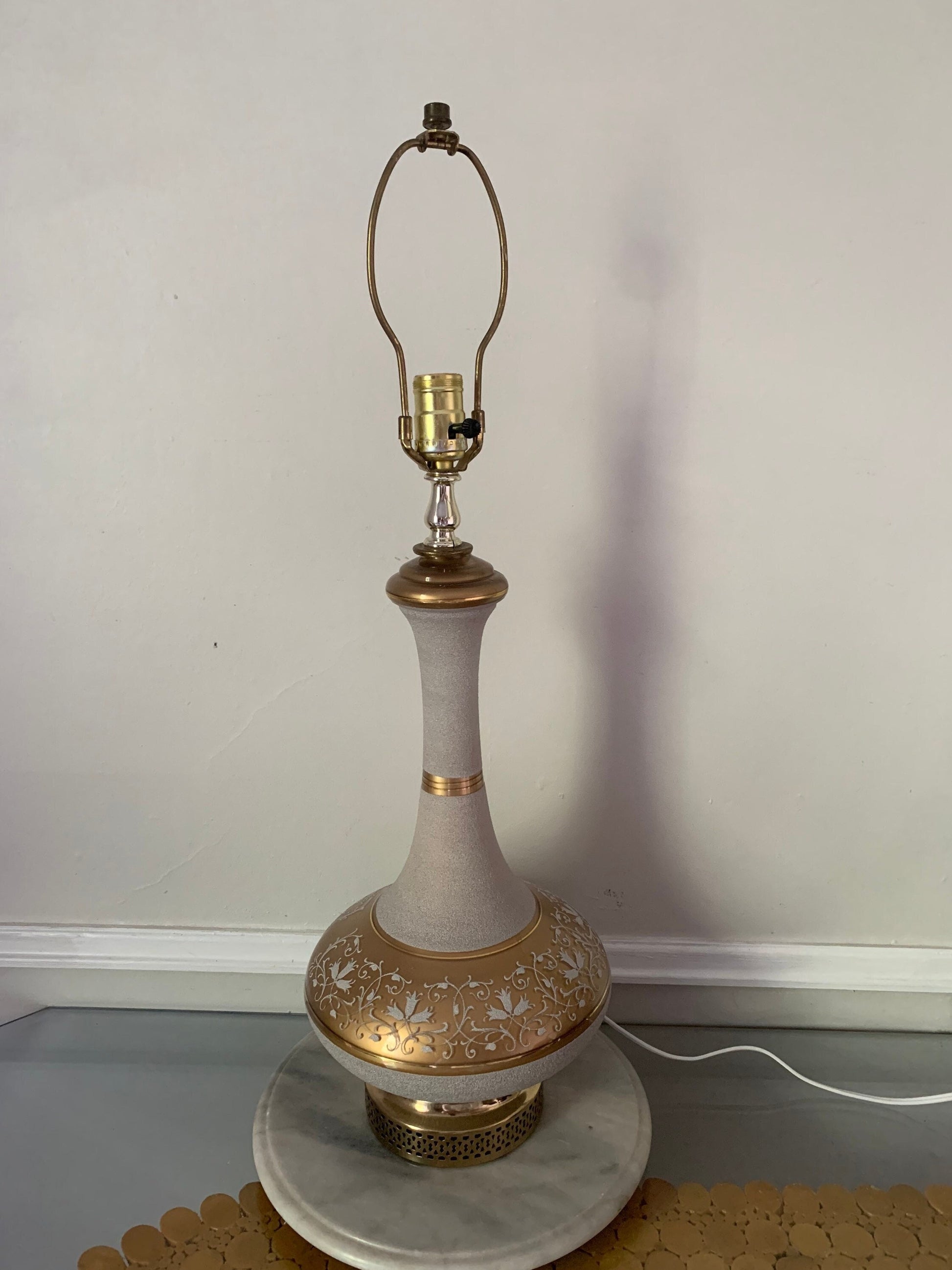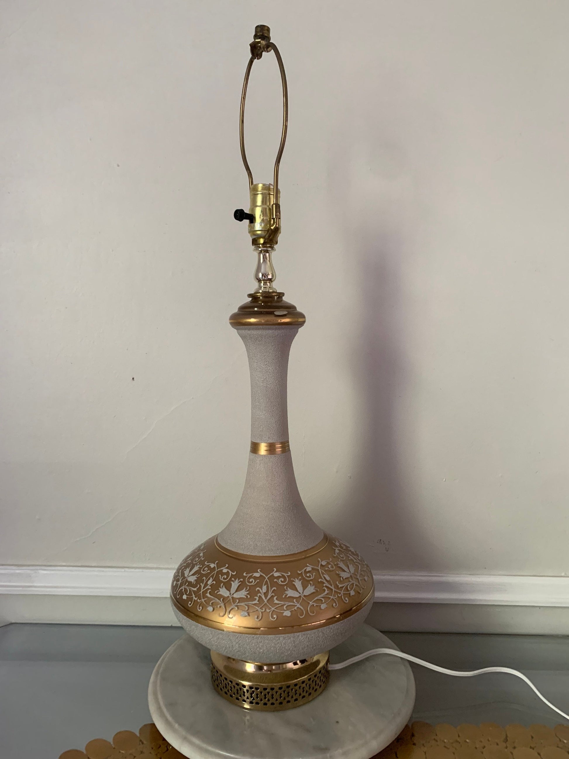 Tall MCM White & Gold Glass Lamp with Brass Base No Shade Made in France