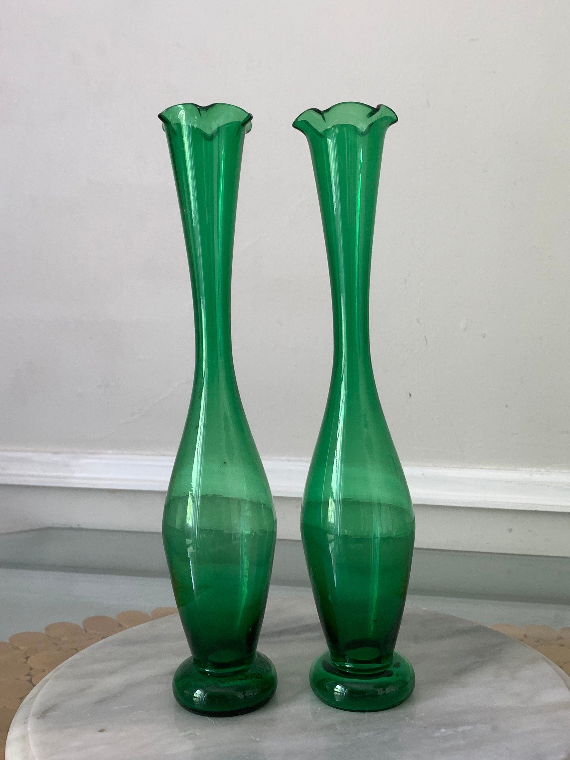 Two Vintage Medium Clear Green Glass Stretch Vases with Scalloped Edge