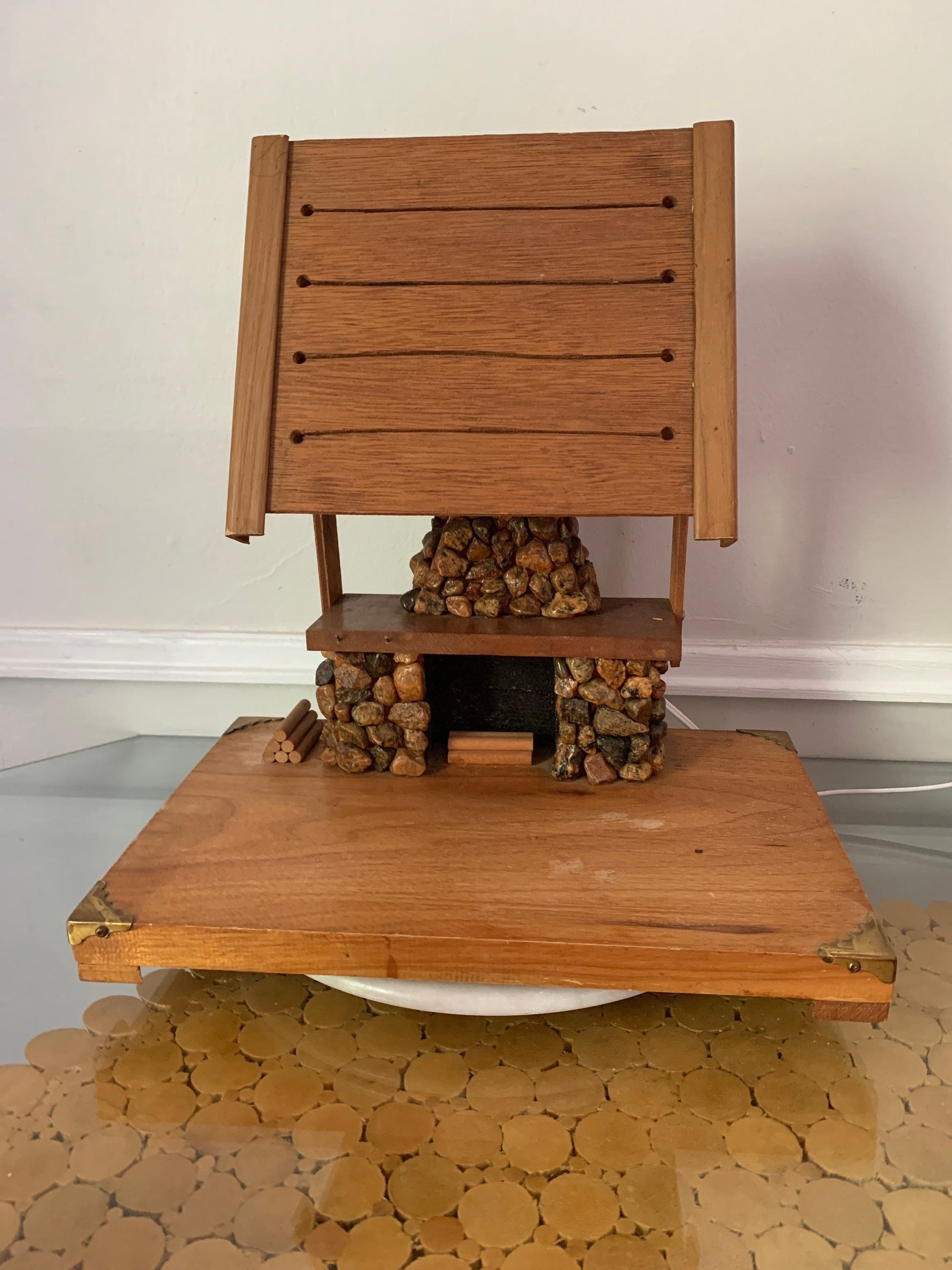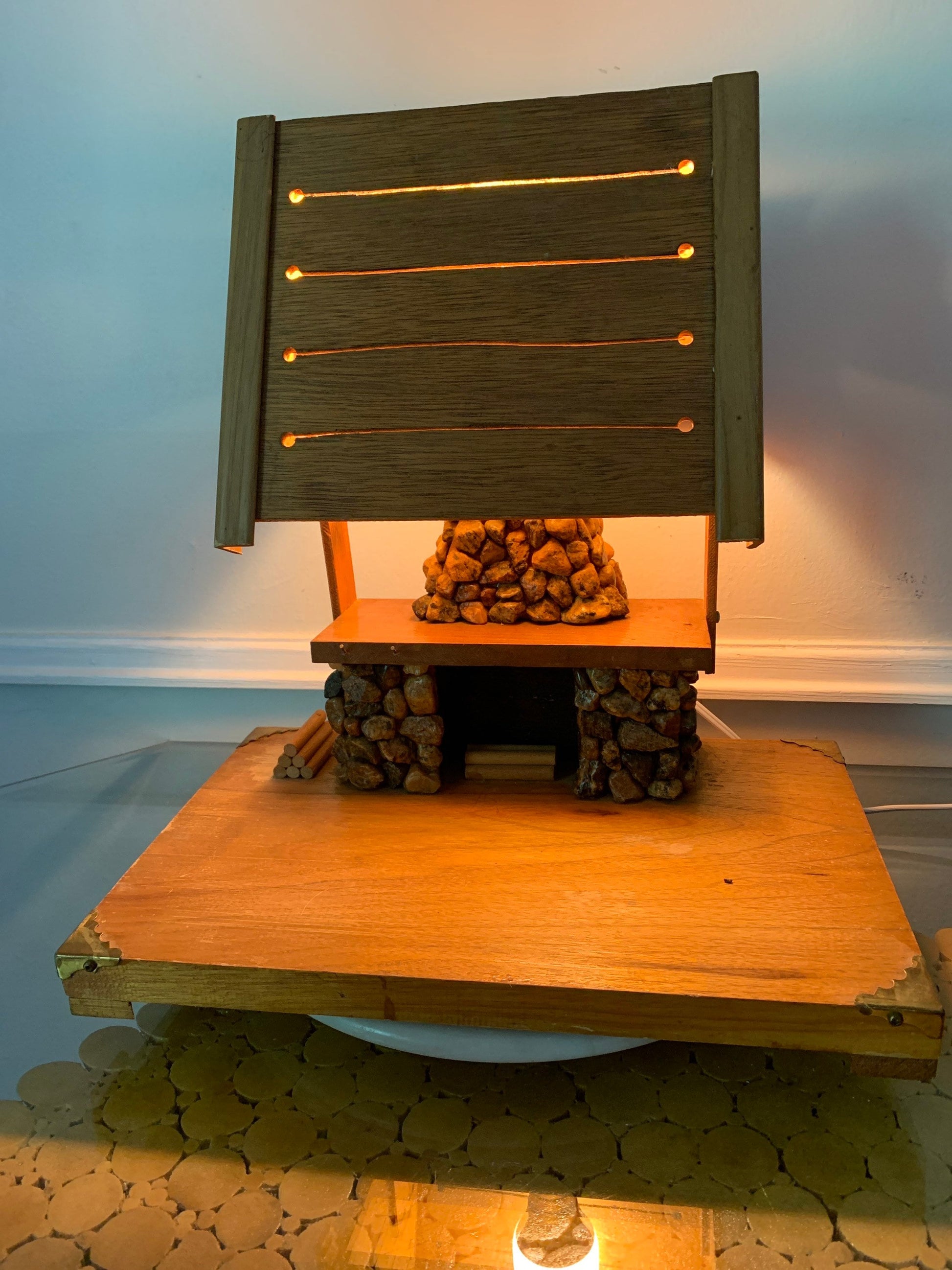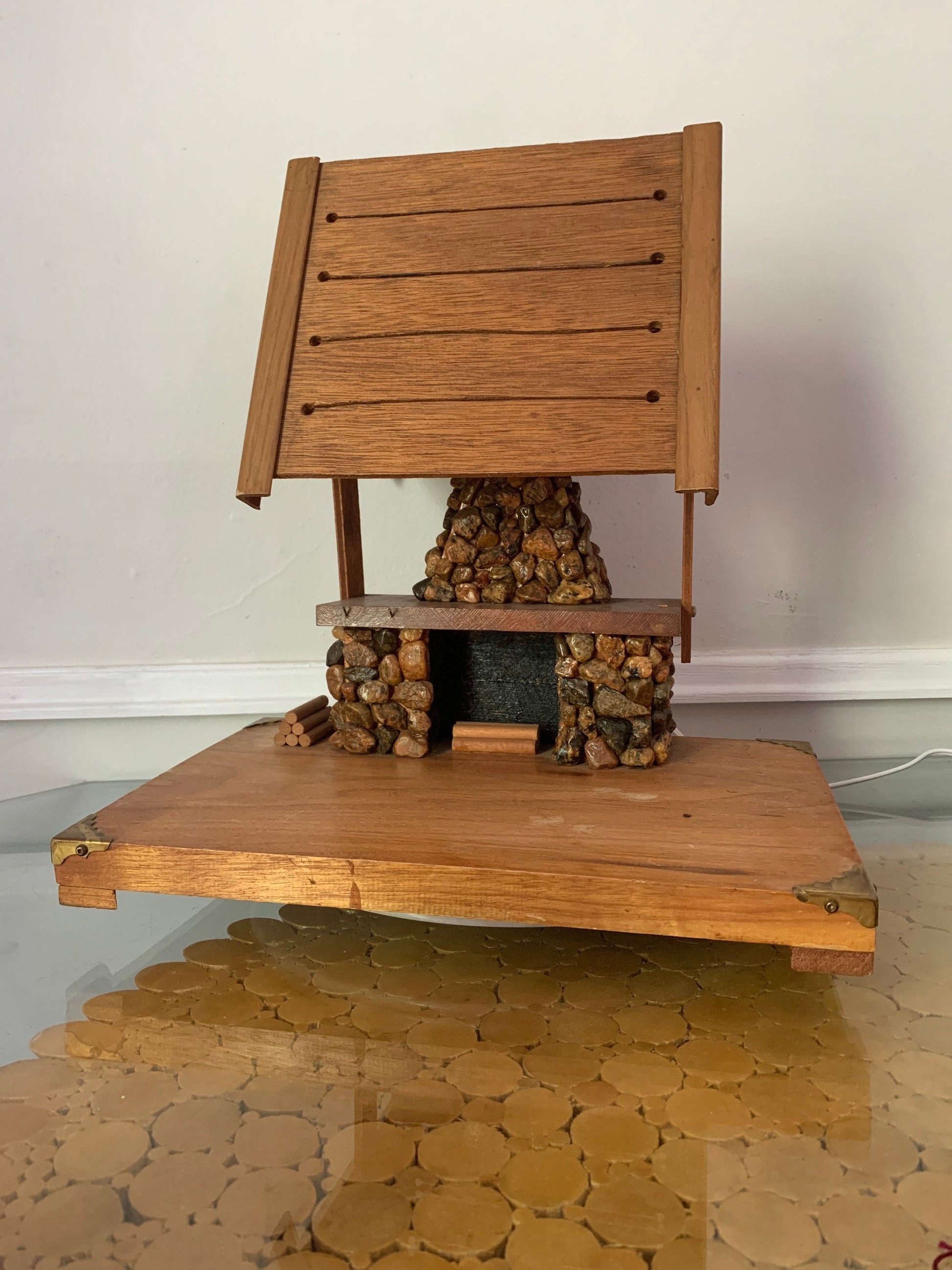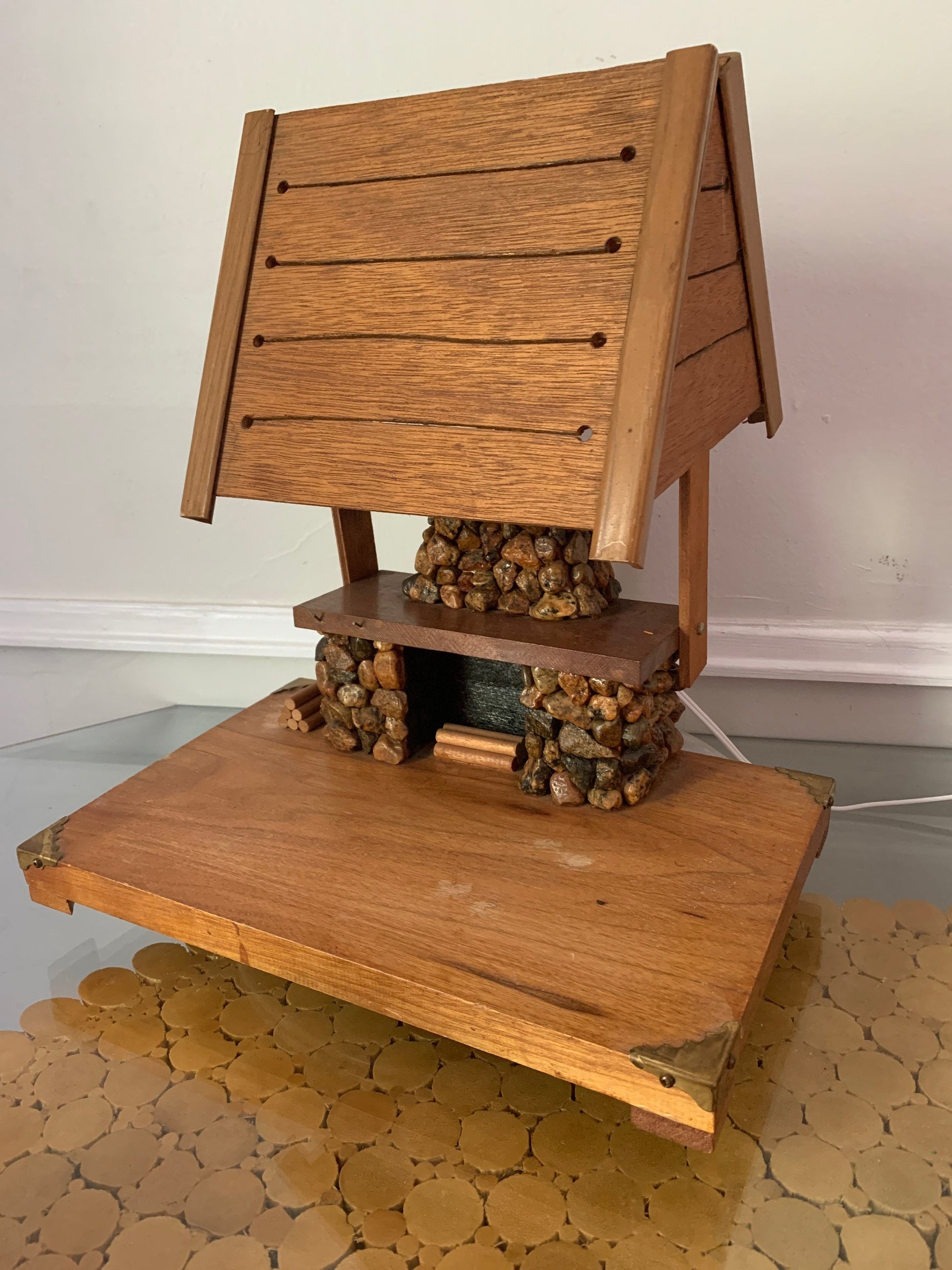Vintage 1960s Wooden Rustic Wood and Stone Folk Art Lamp
