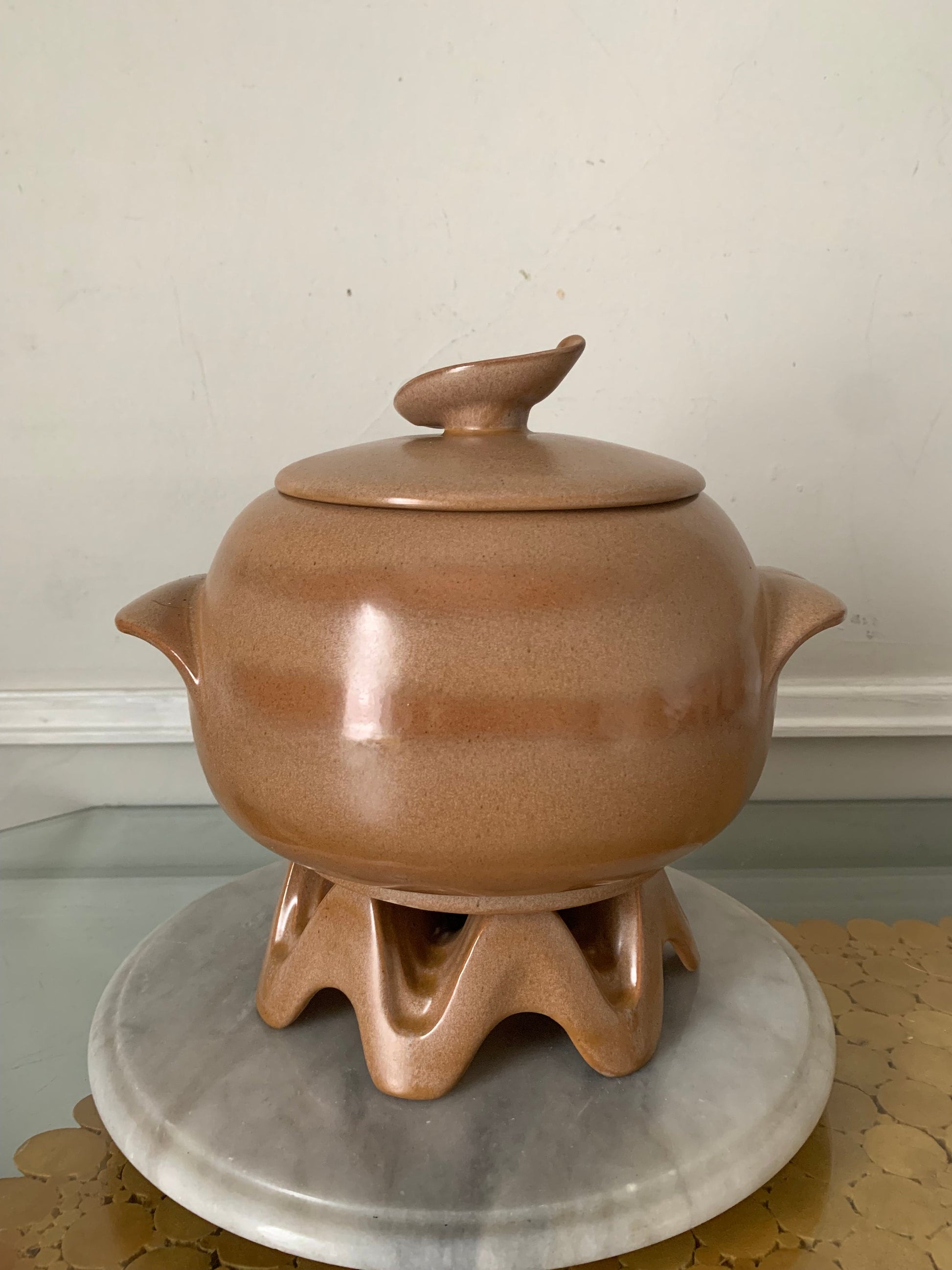 Vintage Frankoma casserole dish with handles; includes lid and warmer stand in a wonderful sand colour. Perfect for baking and serving or simply to display. Labeled Frankoma 4V on the bottom.