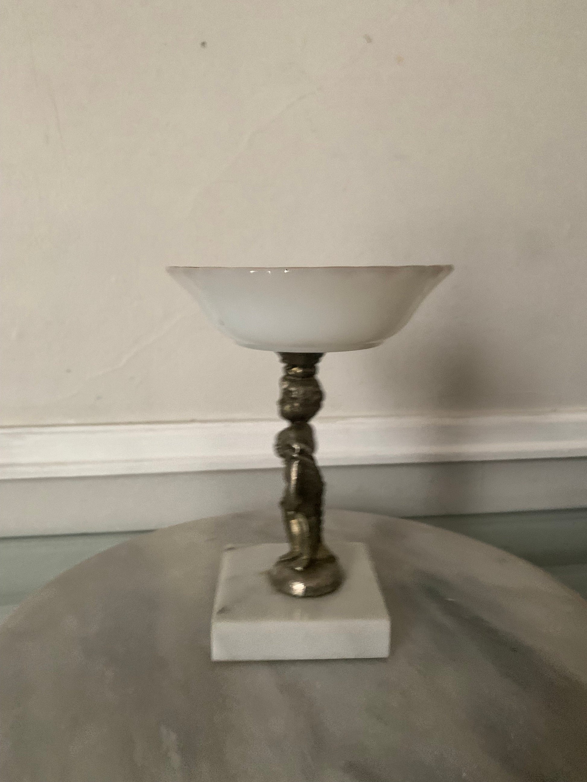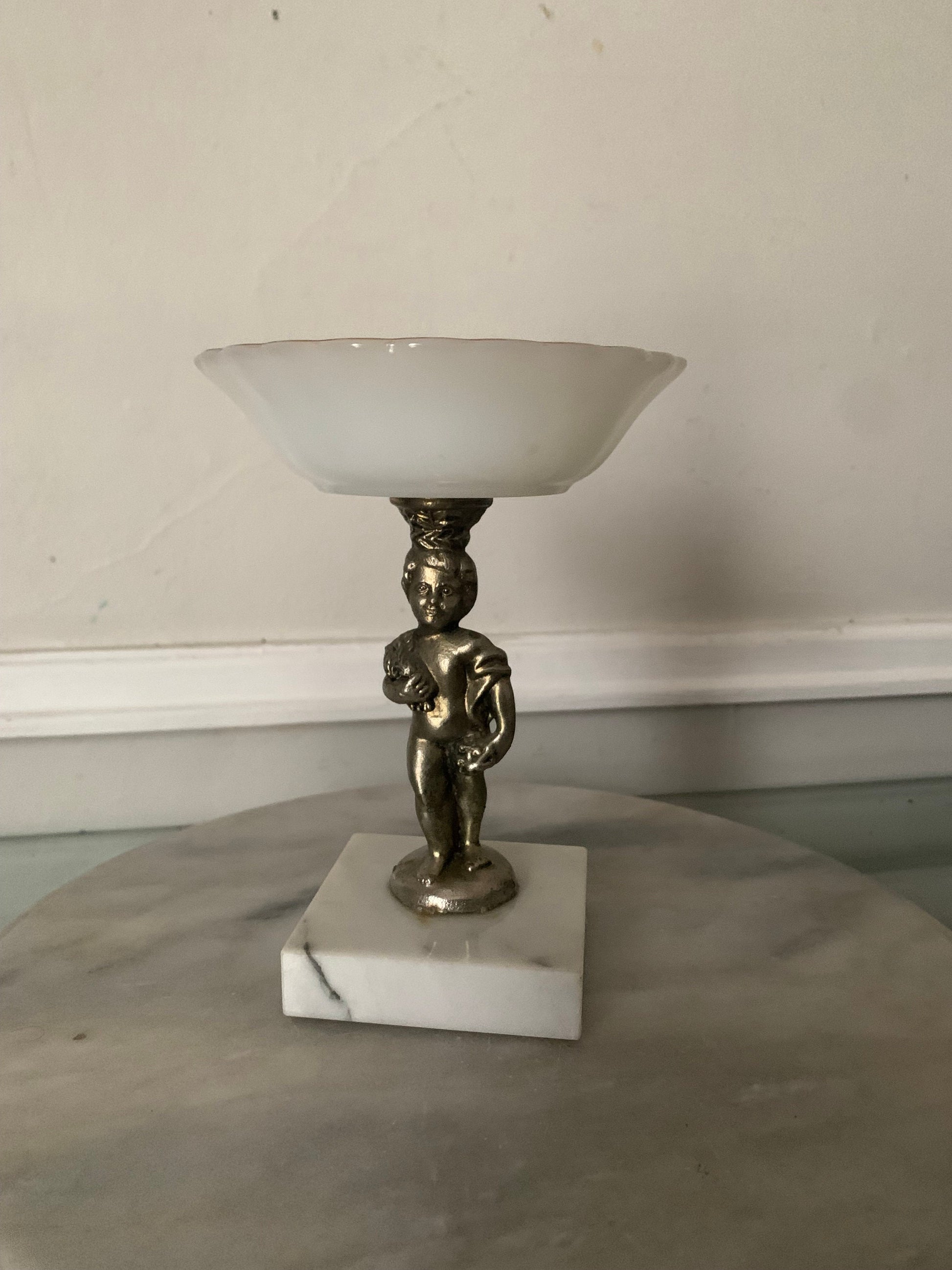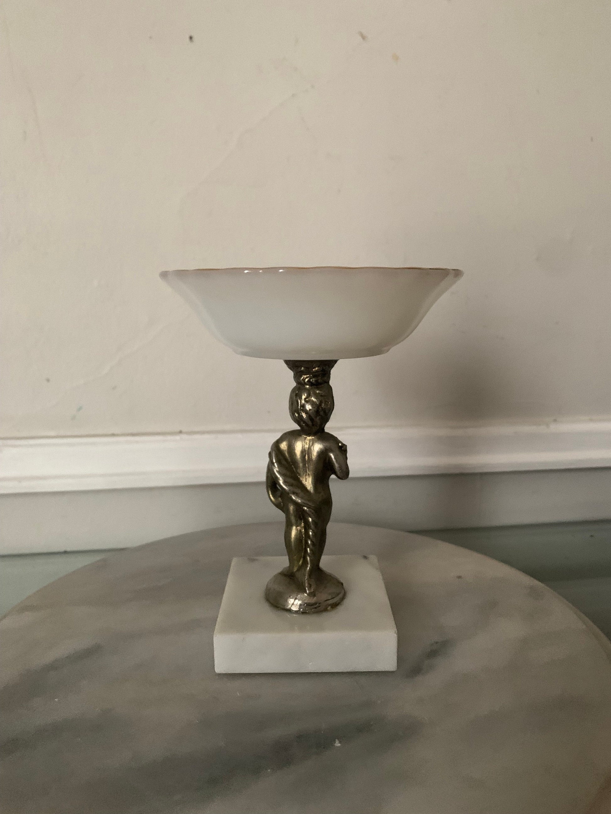 Vintage Milk Glass Pedestal Bowl Gold Tone Cherub Atop Marble Base